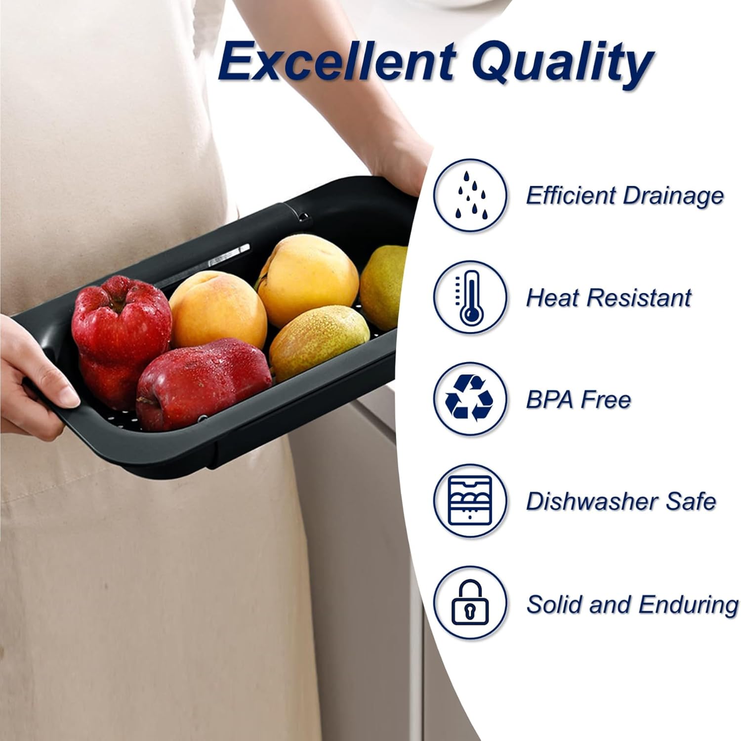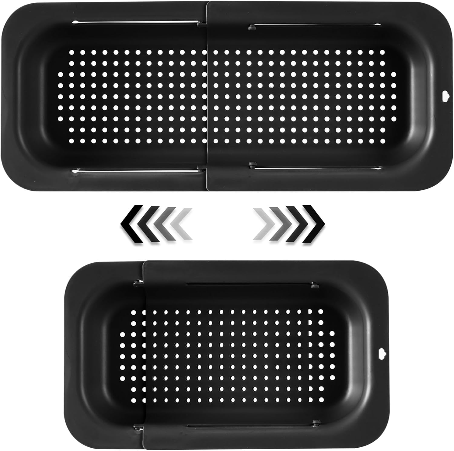 Extendable Sink Colander Strainer Basket - Wash Vegetables and Fruits, Drain Cooked Pasta and Dry Dishes - Adjustable Over the Sink Colander Collapsible Drainer Basket - Black