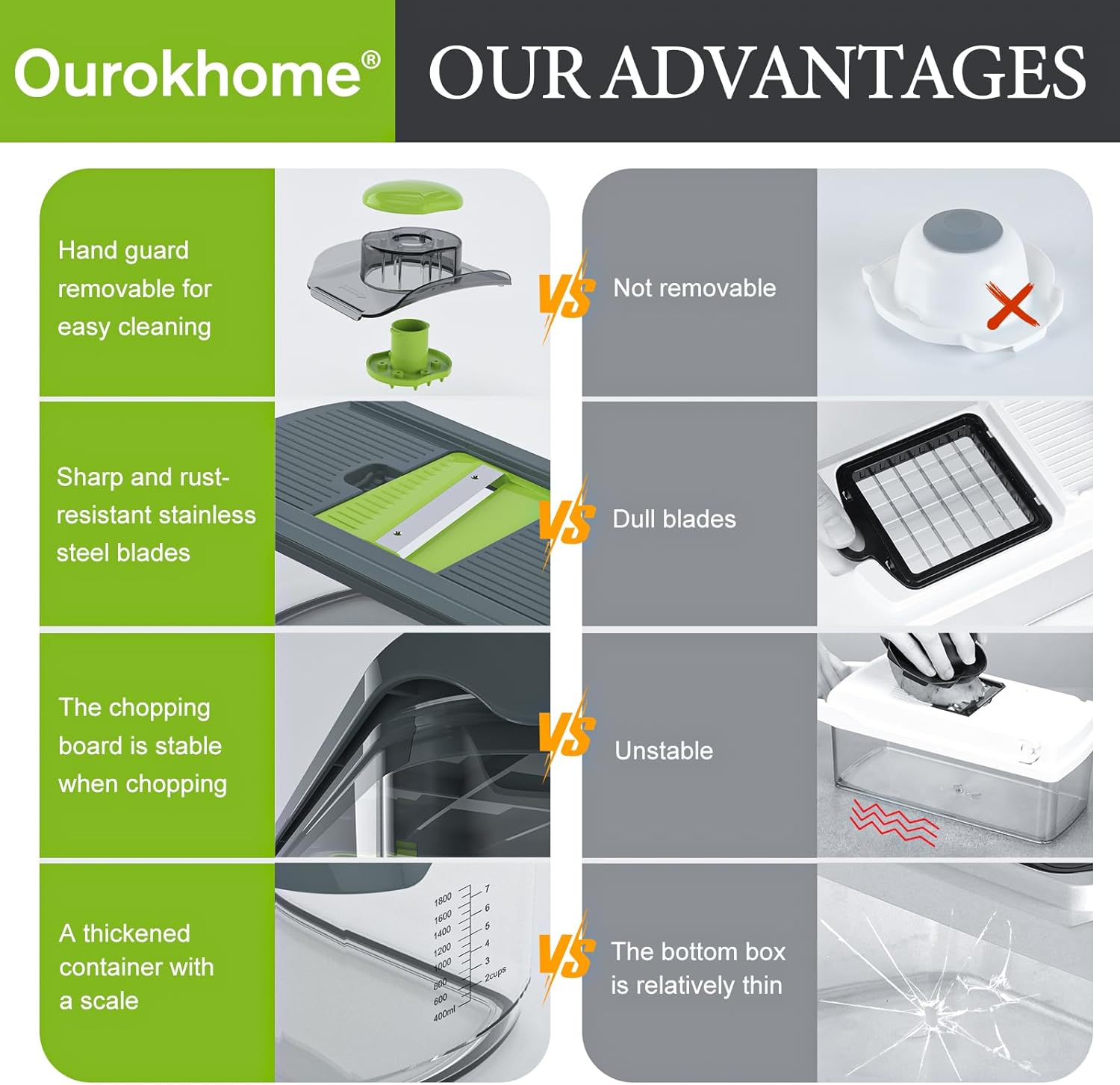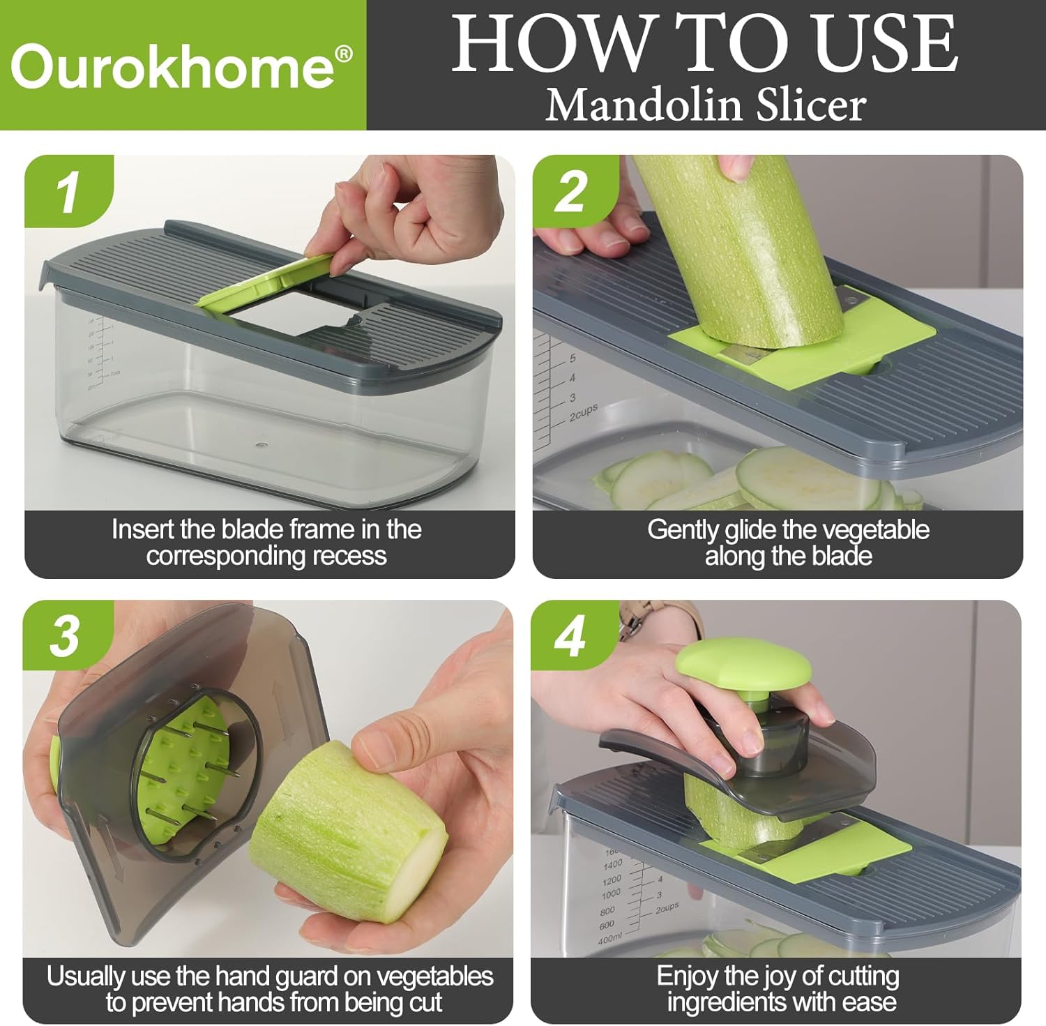 - A kitchen essential gadgets - Whether you're a novice cook or a seasoned pro, the Ourokhome 10 in 1 mandolin slicer and spiralizer is a must-have in any kitchen. It's versatile, easy and safe to use and store, and backed by our 100% satisfaction guarantee.