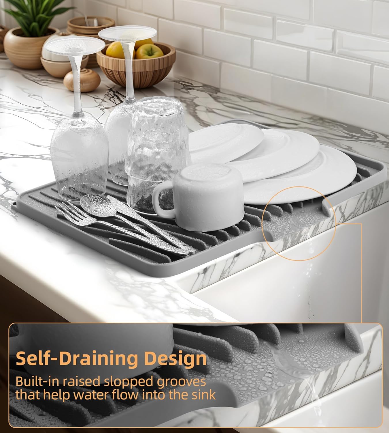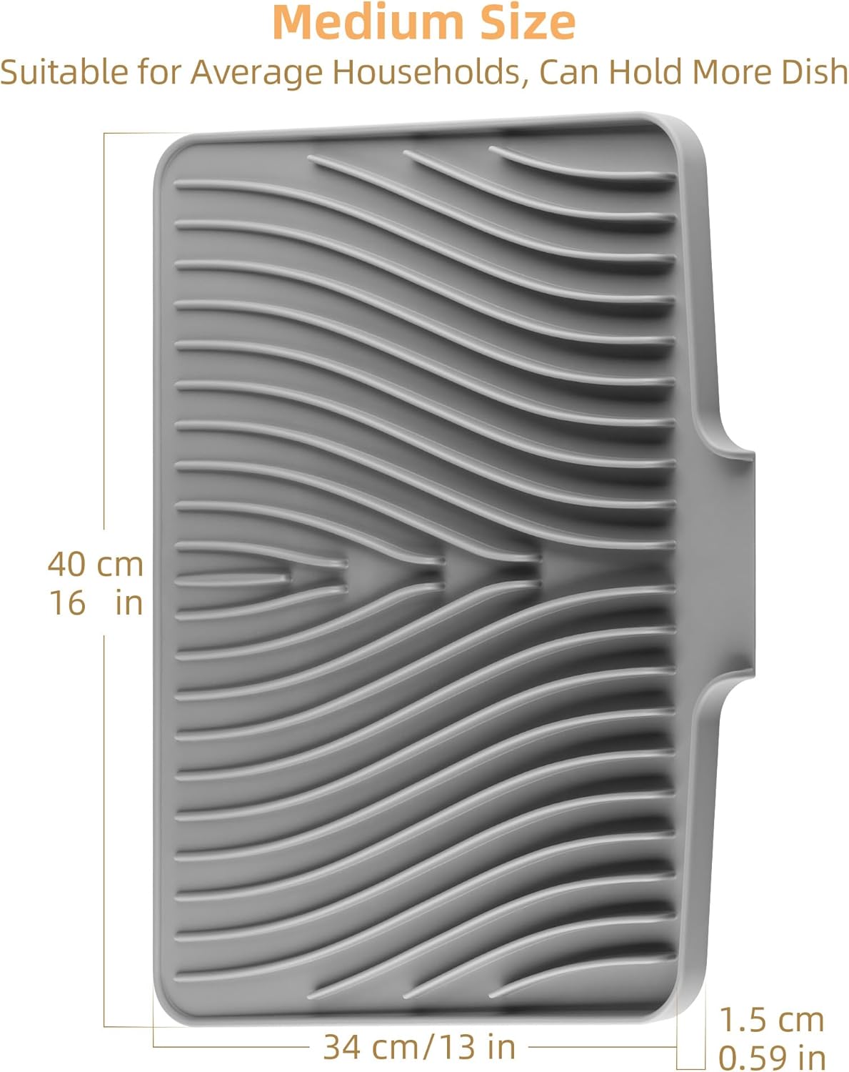 Fuyit Silicone Dish Drying Mat with Raised Drain Lip, Inclined Design, 16" x 13" Heat Resistant Non-Slip Mat for Kitchen Counter or Sink (Gray)