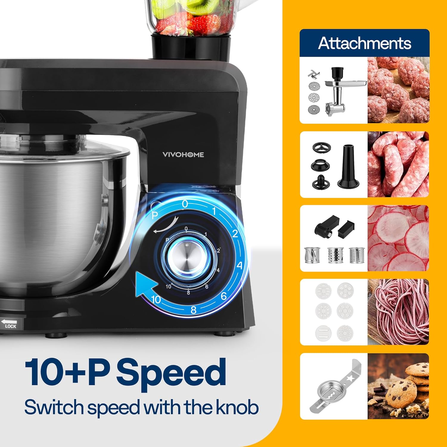 - MULTIPLE ATTACHMENTS: The VIVOHOME stand mixer includes a dough hook, whisk, beater, juice blender, meat grinder, pasta maker, and shredder; These attachments offer a wide range of recipe possibilities; The dough hook kneads flour, the beater mixes butter, and the whisk whips creams; The juice blender helps make drinks, while the meat grinder provides freshly ground meat when needed; The pasta maker and shredder offer even more versatility