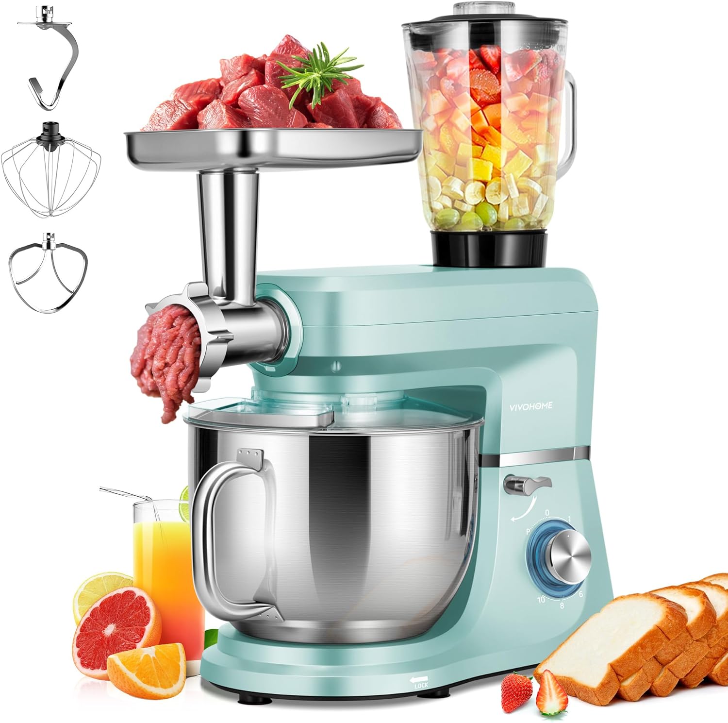 - MULTIPLE ATTACHMENTS: The VIVOHOME stand mixer includes a dough hook, whisk, beater, juice blender, meat grinder, pasta maker, and shredder; These attachments offer a wide range of recipe possibilities; The dough hook kneads flour, the beater mixes butter, and the whisk whips creams; The juice blender helps make drinks, while the meat grinder provides freshly ground meat when needed; The pasta maker and shredder offer even more versatility