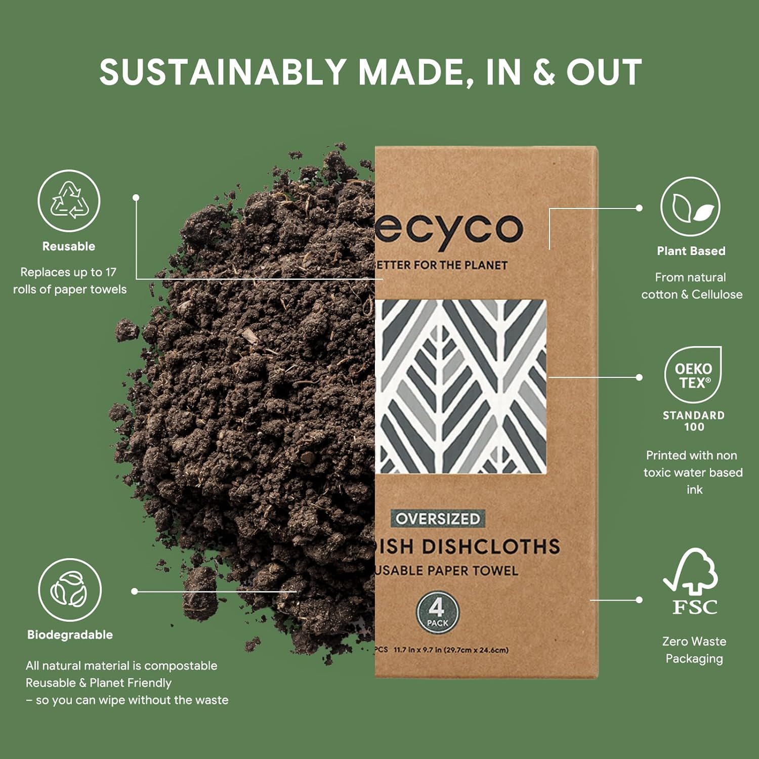 RECYCO Swedish Dishcloths for Kitchen | 4 Pack Oversized Washable Dish Rags | Large Cellulose Reusable Cleaning Paper Towels | Absorbent Counter Dish Cloth Sponge XL Kitchen Wipes, 12" L x 10" W