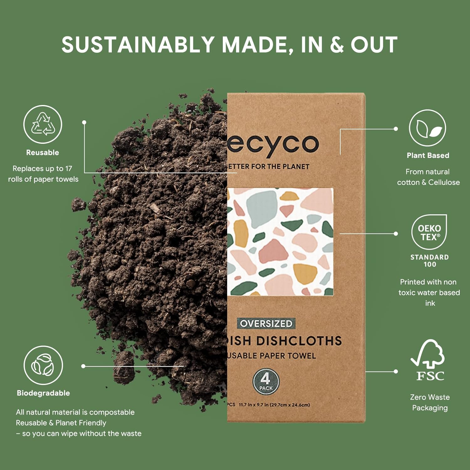 RECYCO Swedish Dishcloths for Kitchen | 4 Pack Oversized Washable Dish Rags | Large Cellulose Reusable Cleaning Paper Towels | Absorbent Counter Dish Cloth Sponge XL Kitchen Wipes, 12" L x 10" W