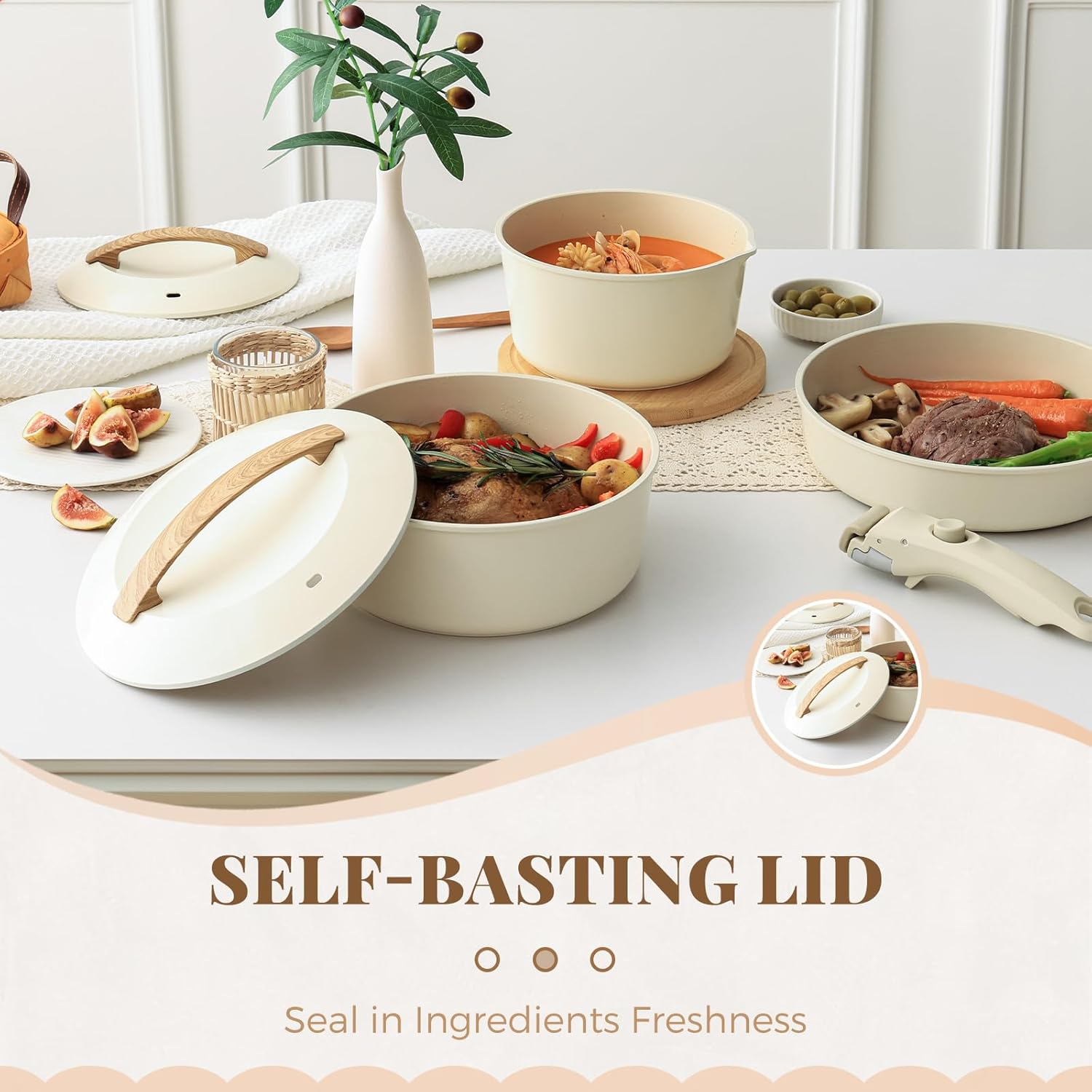 Ceramic Pots and Pans Set with Detachable Handle, Non-toxic Nonstick 8pcs Cookware Set with Die-cast Lids, Dishwasher & Oven Safe, PTFE PFOA PFAS Free, Perfect for College Dorm, Cream White