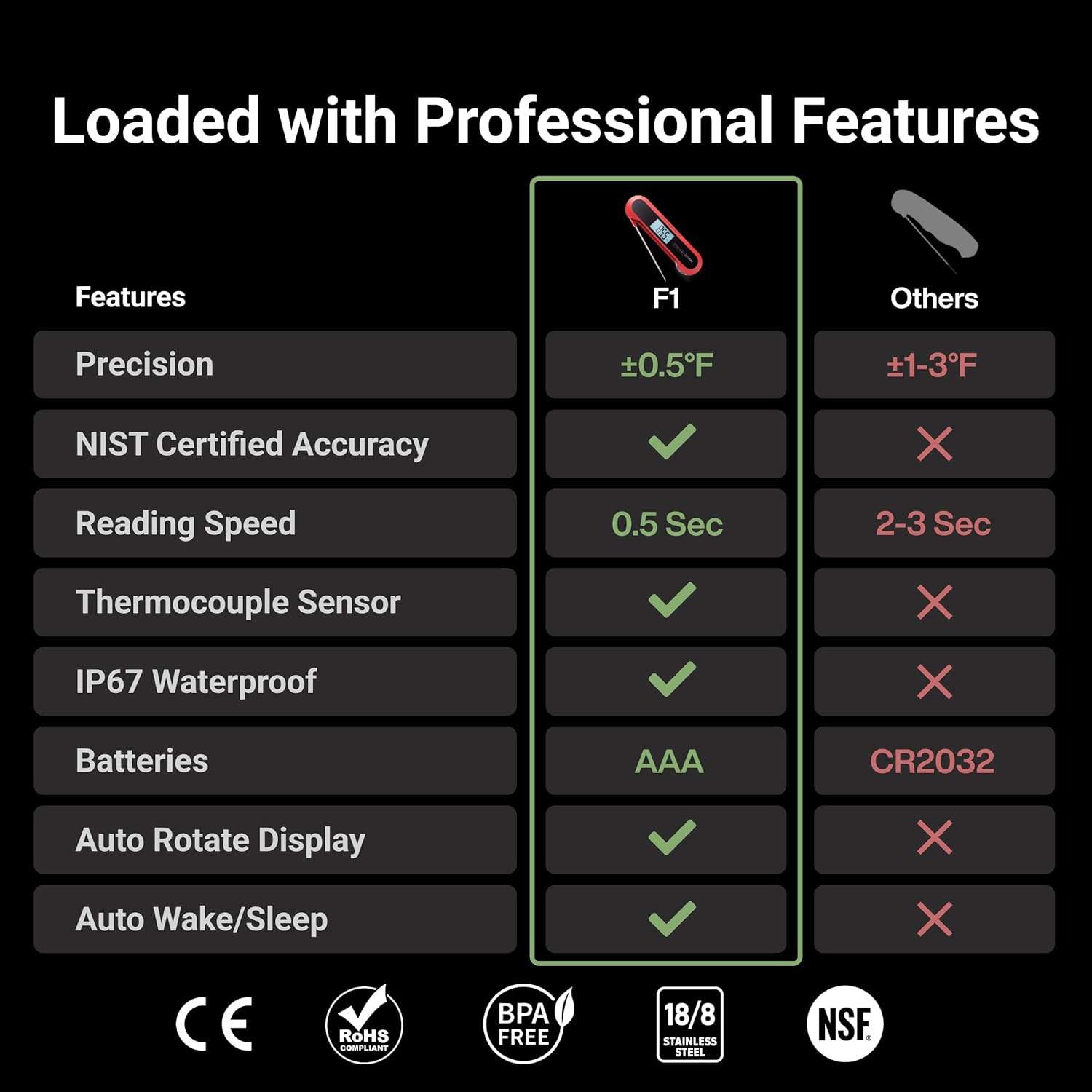 - NIST Certified Accuracy: Officially certified by NIST for high accuracy to 0.5°F(0.3°C). Enjoy high precision and never overcook or undercook your meat again.