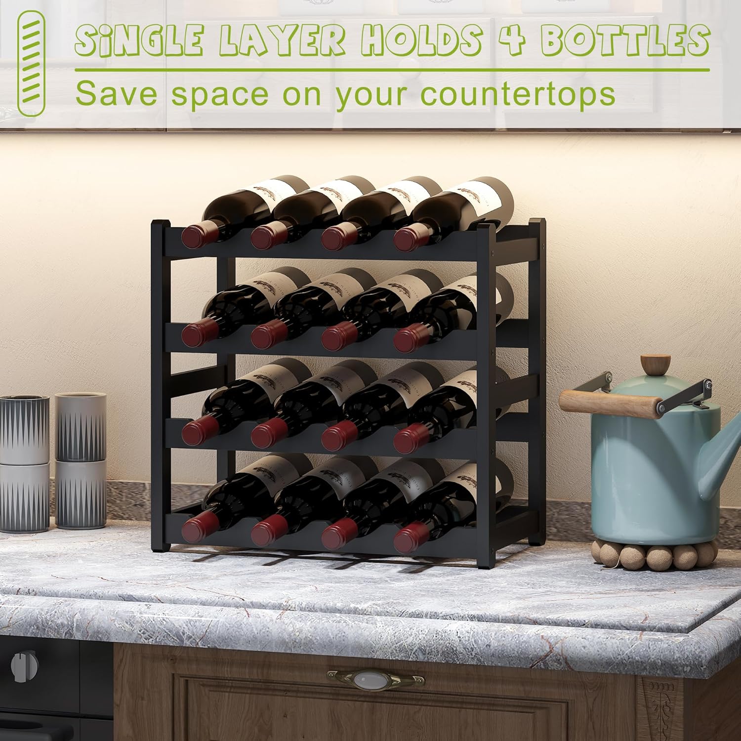 - Save Space:The wine rack can store 4 bottles of wine on each layer, The multiple options of 2/3/4 layers of wine rack brackets can hold multiple bottles of wine, allowing you to save a lot of space and freedom of choice