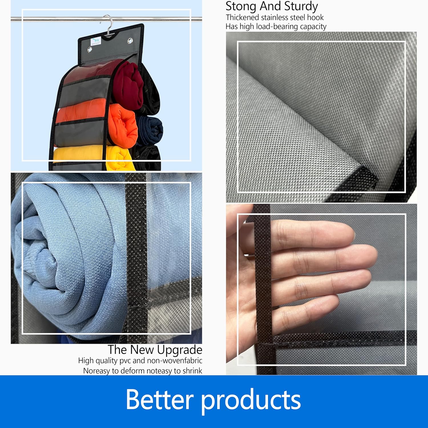 - closet organizers and storage,The thicken metal hooks ensure durability and stability when hanging, providing reliable support for your belongings.legging organizer,closet organizer,Each individual pocket is very roomy. closet organizers and storage、The clear plastic makes it easy to see what’s stored inside. The hanger is sturdy and holds the weight(40lb)Very strong load-bearing,The pockets are giant.
