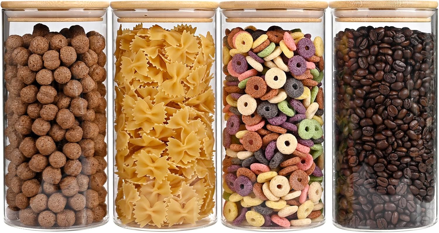 - [Premium quality and safety assurance] Our glass containers with bamboo lids are made of premium quality and borosilicate glass, glass pantry storage containers can withstand the harsh tests of daily use. The bamboo lid provides an airtight seal, ensuring the freshness of stored food. Our glass food storage jars are BPA Free, Phthalate Free, PVC Free, Lead Free, They are healthy and reliable choice for your kitchen.