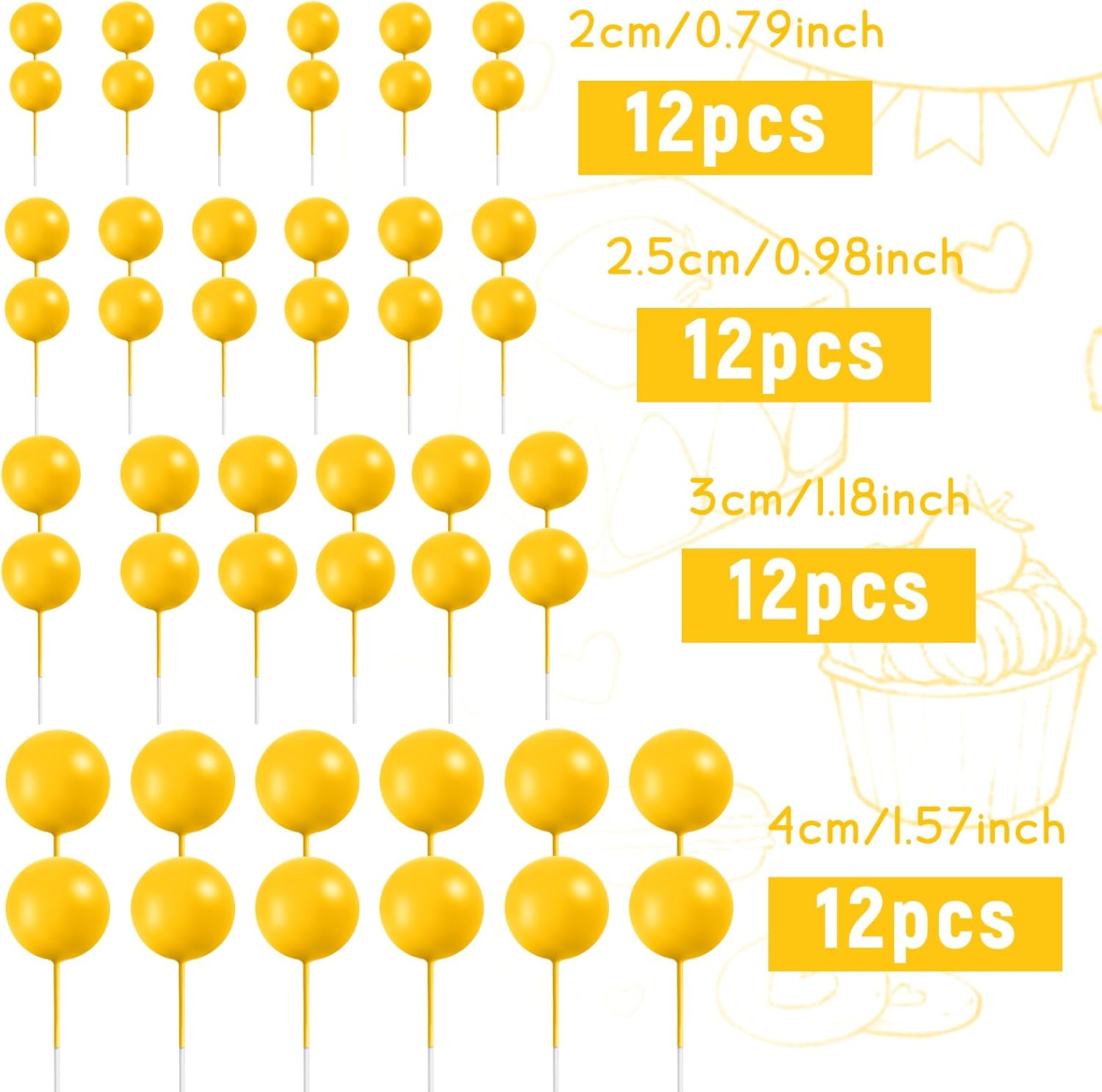 - Package Includes: You will get 48 pcs yellow cake balls in 4 sizes, the quantity of each sizes included in each set are as shown in the picture