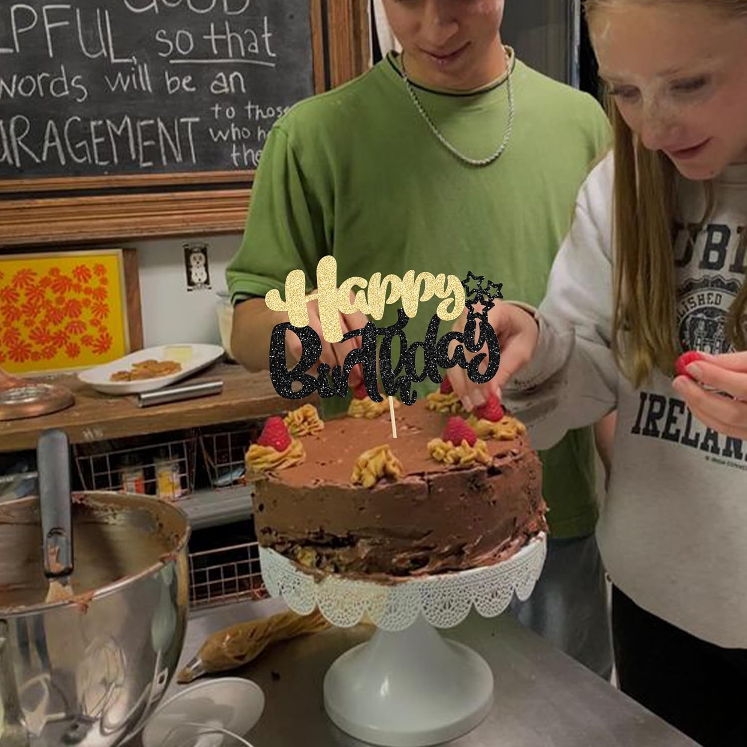 Ephlyn 1Pcs Happy Birthday Cake Topper Glitter Cake Pick for Celebrating Anniversary Theme Party Cake Decorations Supplies Black Gold