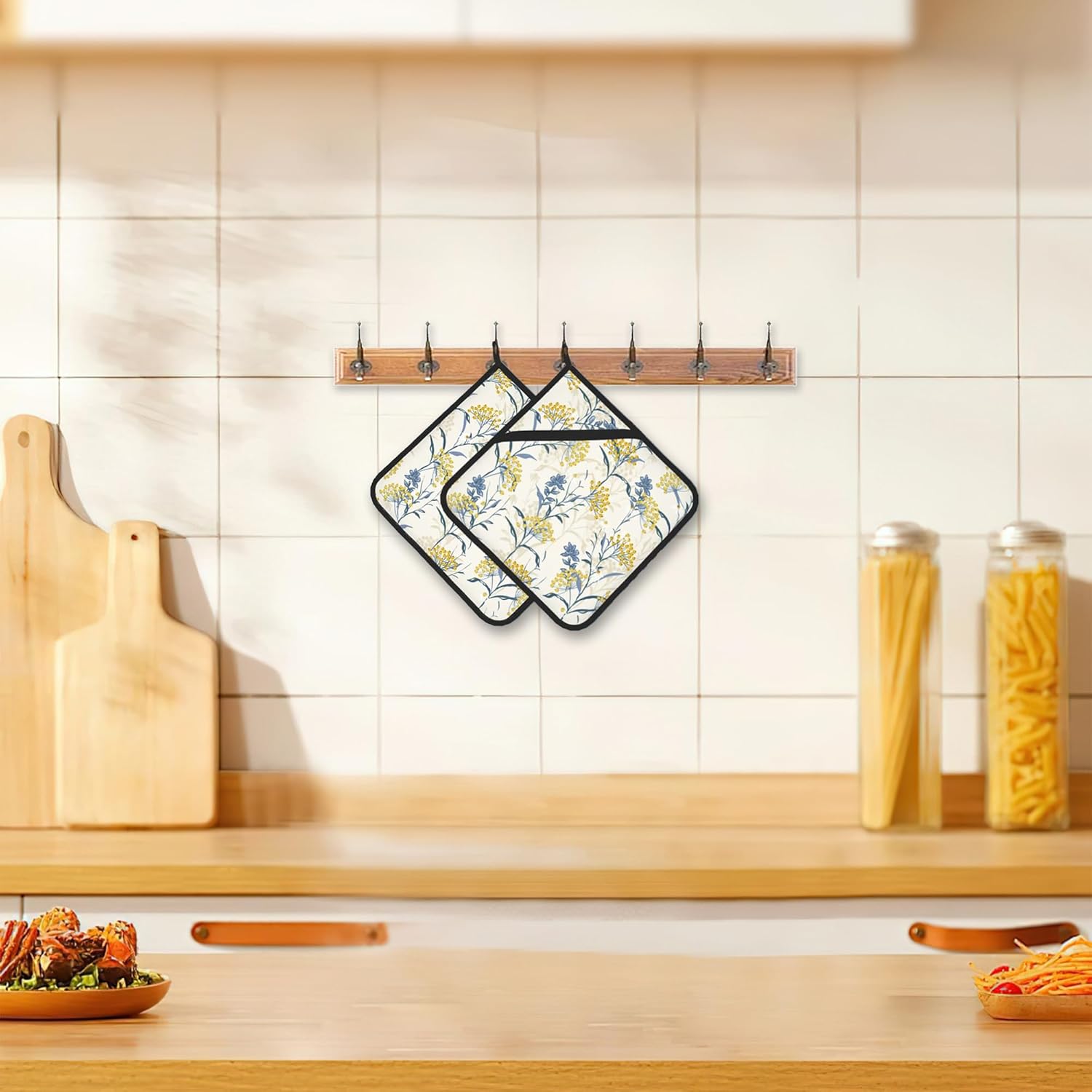 Vintage Floral Plan Pot Holders Set of 2 Heat Resistant Potholders,Yellow Blue Fire Oven Hot Pads for Kitchen Cooking Baking Barbecue