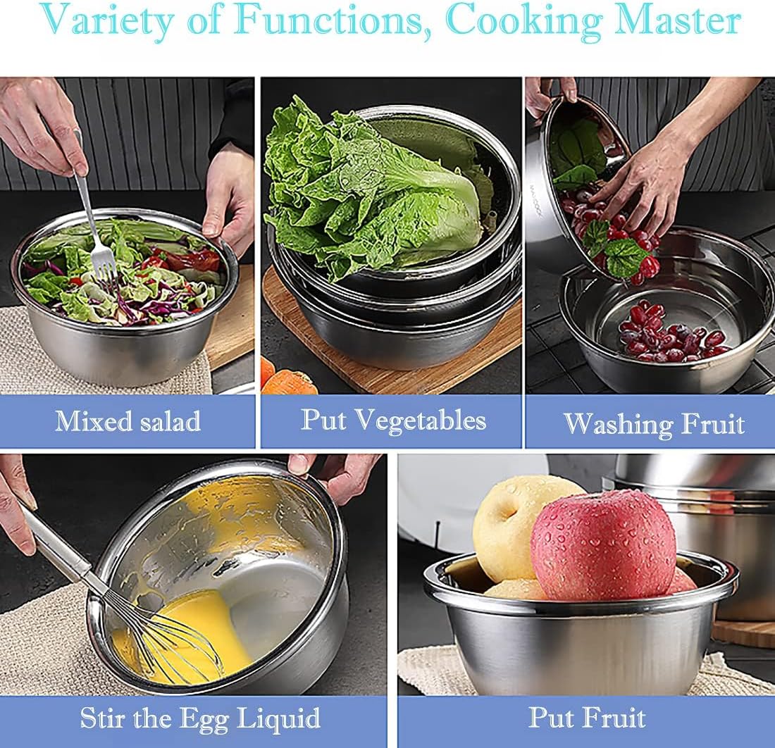 - 【PROTECT YOUR HAND】- Our stainless steel bowl have thicken edge design,with curling,do not hurt the hand,not deformation,easy to take. Metal bowls can be used as cooking, mixing, baking, storage, serving, soup and salad bowls to meet all your kitchen needs.