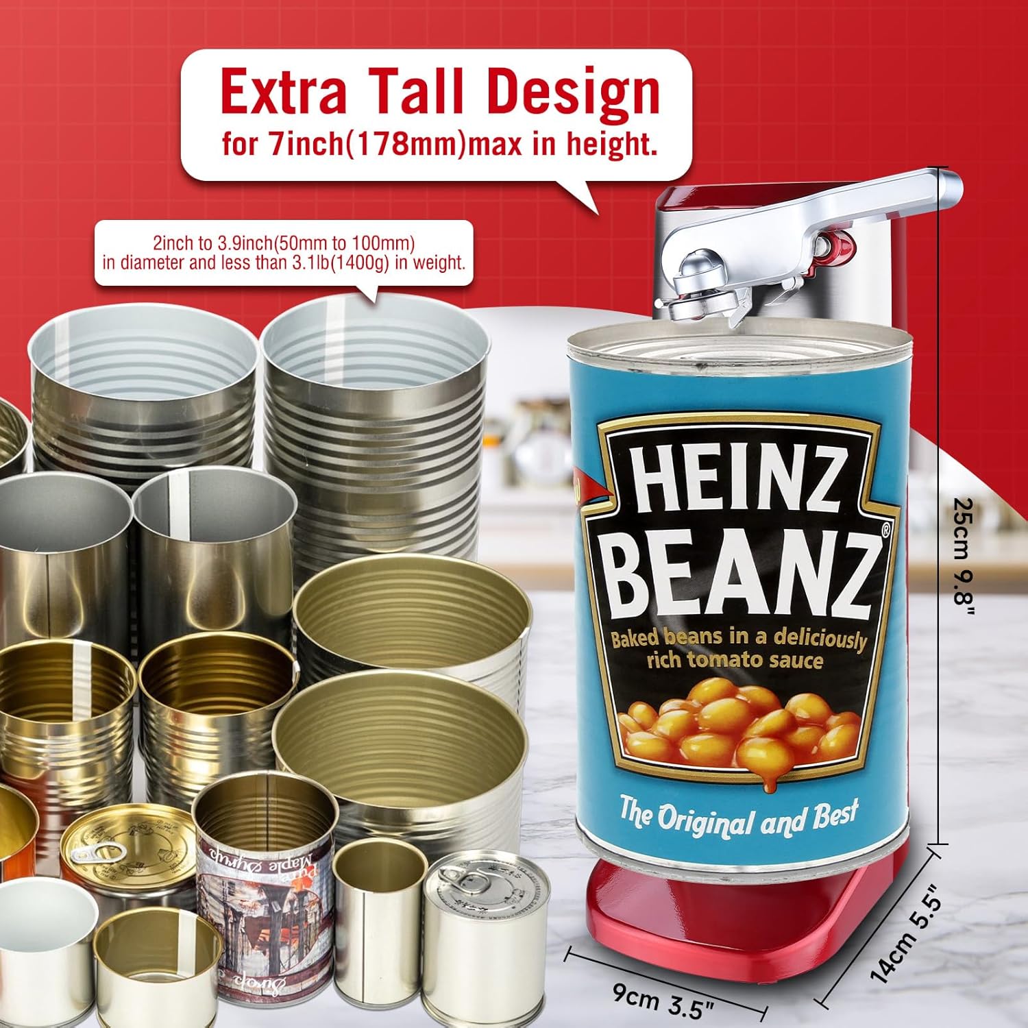 - 【Opens almost Any Cans】With a heavy-duty motor and a stable base to keep it steady during operation, our automatic can opener can open all types of cans from 50 to 100mm in diameter,net weight ≤ 1400g and height less than 178mm.Whether you have square cans, round cans, or even deformed cans (except for cans with recessed edges).