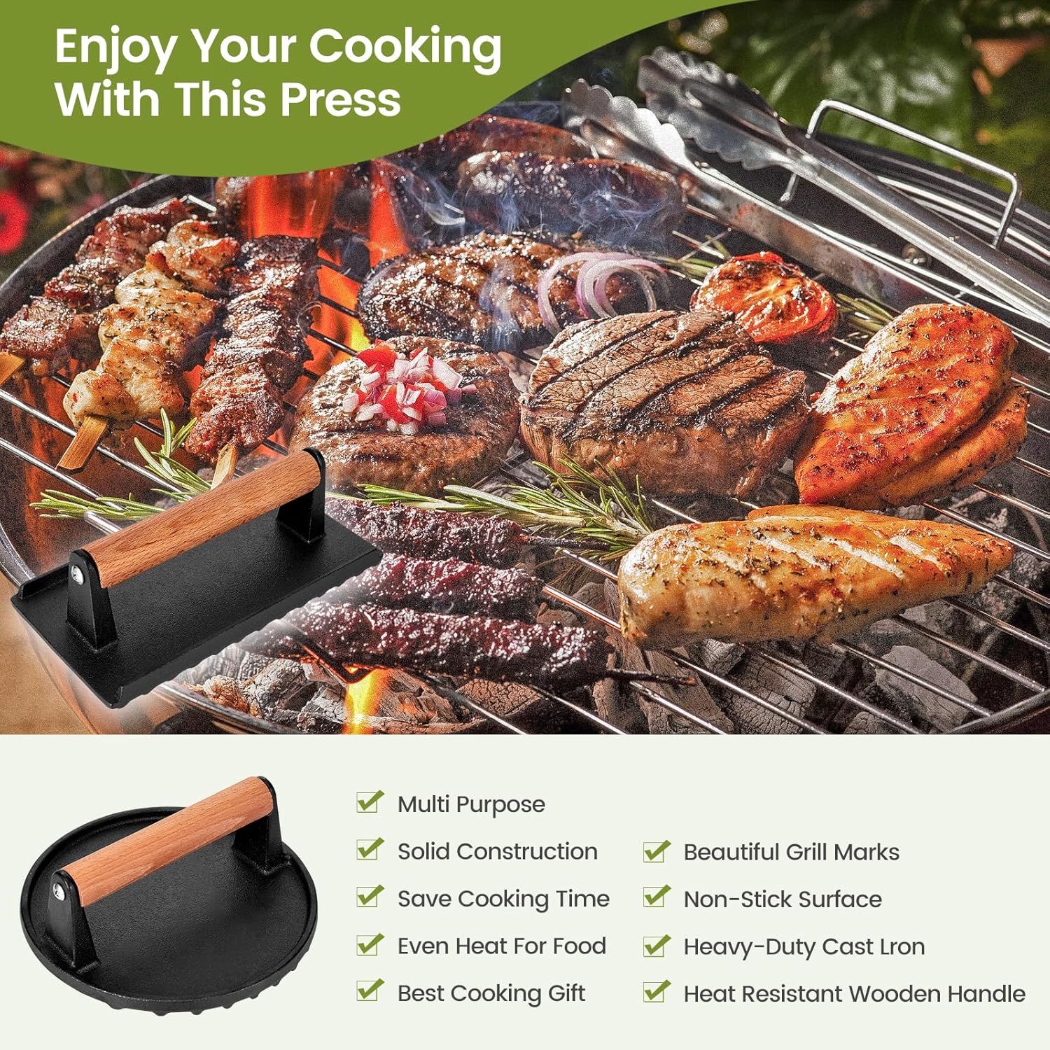 - Food-Grade Cast Iron Burger Press : Our barbeque grill press is crafted from 100% food-grade cast iron without any harmful coatings, the press can also be seasoned like cast-iron skillets to create a non-stick surface; Use the grill weight to press out unwanted grease and fat, flattening the meat and keeping its shape, keeping bacon, steaks, pork chops from curling after pressing. Our smash burger press kit are perfect for Blackstone and provide professional grilling experience at home