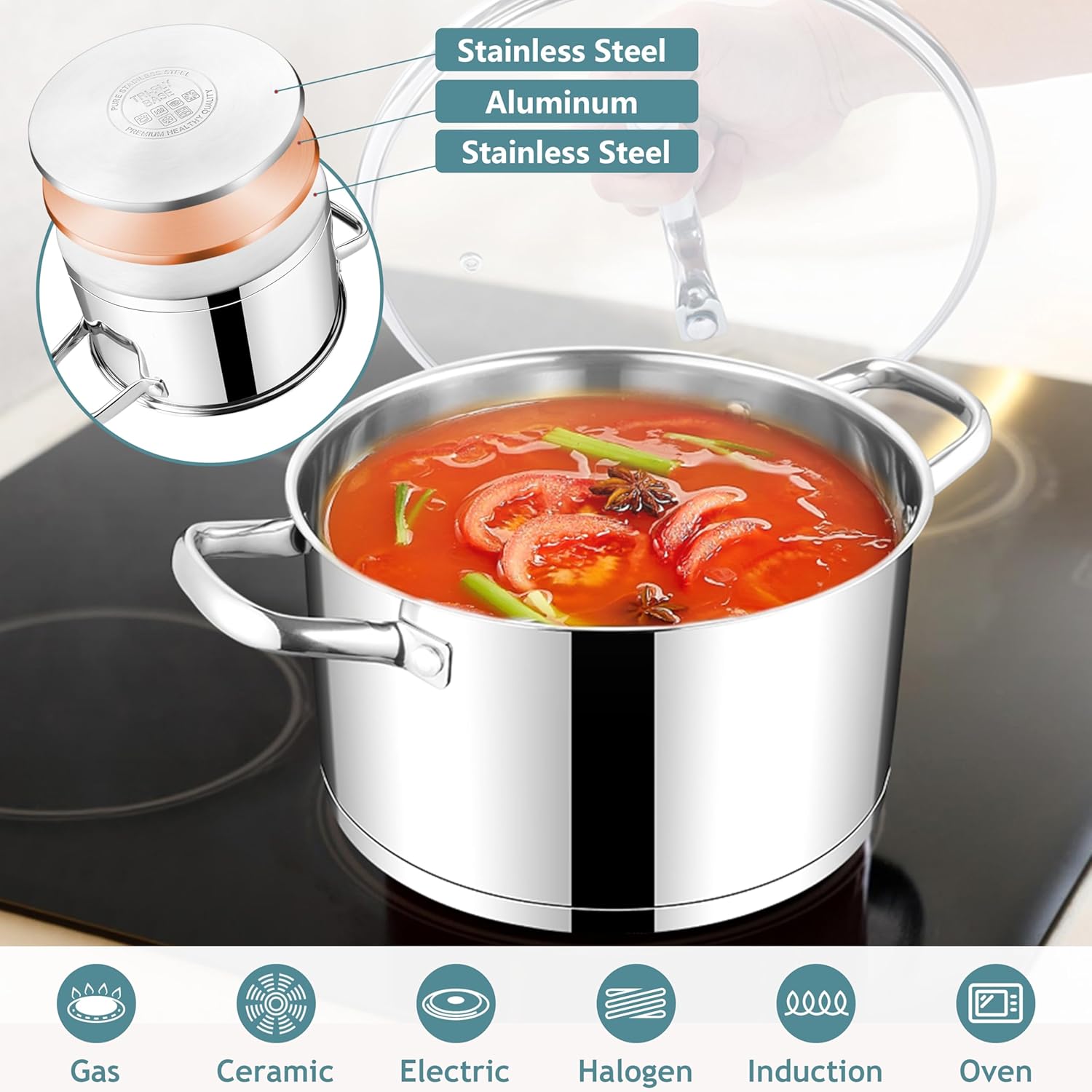 E-far 6 Quart Stock Pot with Lid, Stainless Steel Stockpot for Cooking Simmering Soup Pasta Sauce, with Tri-Ply Bottom & Visible Cover, Induction/Gas/Dishwasher Safe, Heavy Duty & Non Toxic