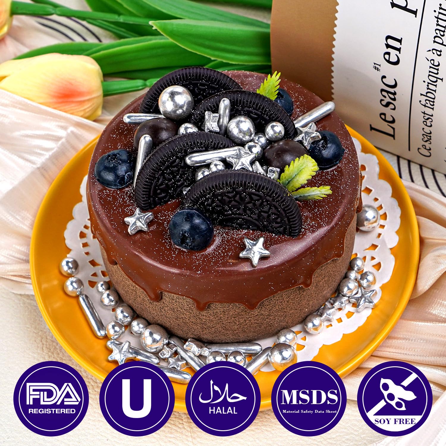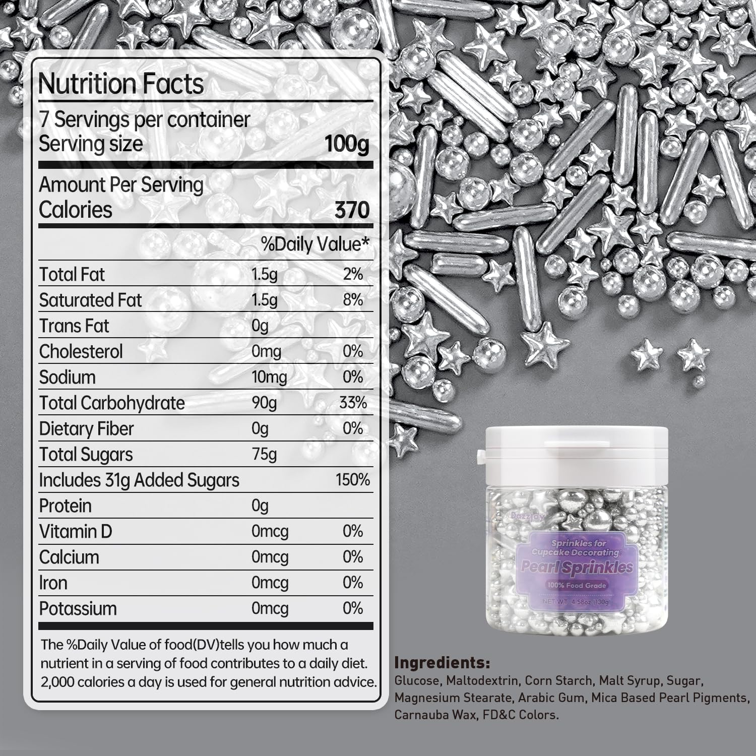 - Silver Pearl Ball Sprinkles with food-grade raw materials. Preservative Free, Nut Free, Dairy Free, Chemical Free, Soy Free, Non-GMO. Produced using food-safe standards, the process does not come into contact with allergenic substances and uses Tamper-proof food label. Have Kosher and Halal Certification.