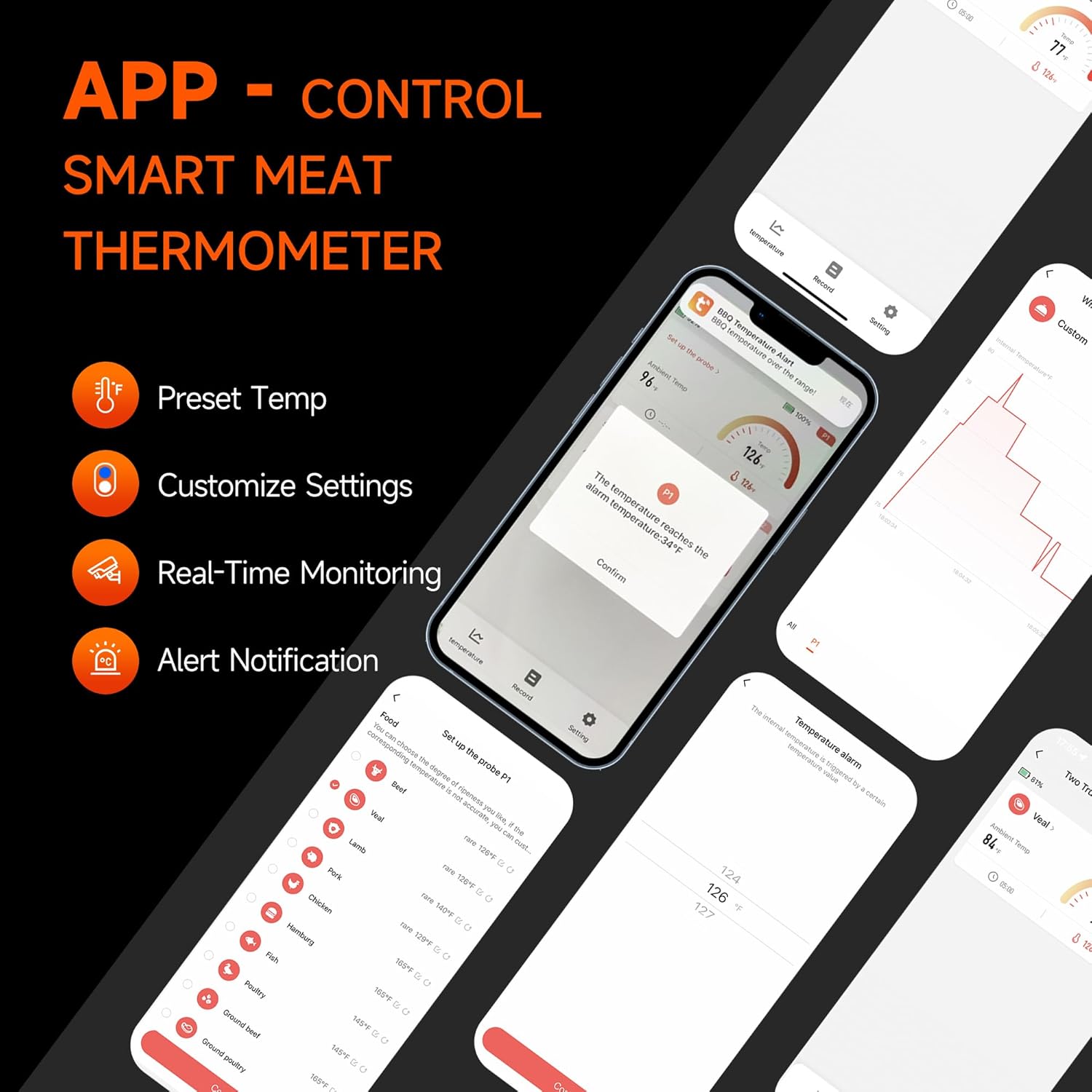 - 【App Presets and Recipes】Set yourself up for culinary success with our digital thermometer's pre-programmed functions specifically designed for different types of meat. Perfect for beginners, it lets you prepare beef, veal, lamb, turkey, pork, fish, and more with precision and simplicity.