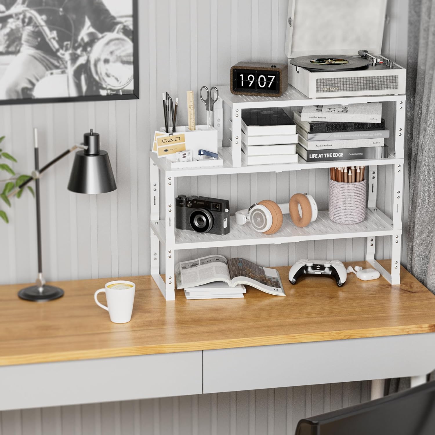 - ⭐【Expandable,Stackable】The shelves can easily expand and contract according to your storage needs, whether it is kitchen clutter or office supplies.You can combine multiple shelves together to form a large storage system, or separate them into several separate smaller units(Measure:8.11"D x 16.54"W~27.17"W x 8.31"H/7.68"H/7.05"H/6.42"H)