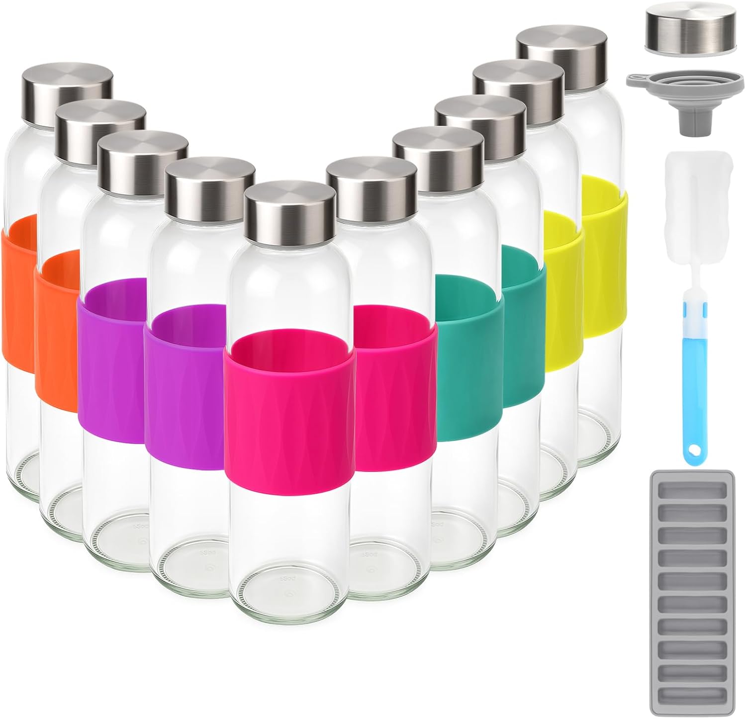 - SAVE MONEY WITH THIS VALUE PACK: Juicing Kit Bundle includes : 10 pack clear 18 oz Zukro glass juice bottles with airtight lids, a bottle cleaning brush for easy hand washing, a funnel helps you pour liquids inside the glass containers, an ice tray makes long and narrow ice cubes for adding ice easily, extra 1pc stainless steel airtight lids to ensure that the reusable glass bottles always remain sealed. Get our juicing bottles in bulk packs as gift for your whole family and friends