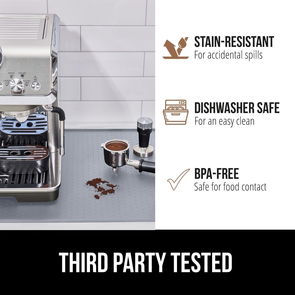 - THICK, 100% WATERPROOF SILICONE: help protect your countertops from accidental spills and stains with Gorilla Grip’s thick silicone and waterproof coffee mat; featuring 1/8th inch raised edge to help contain liquids and prevent accidental stains and mess