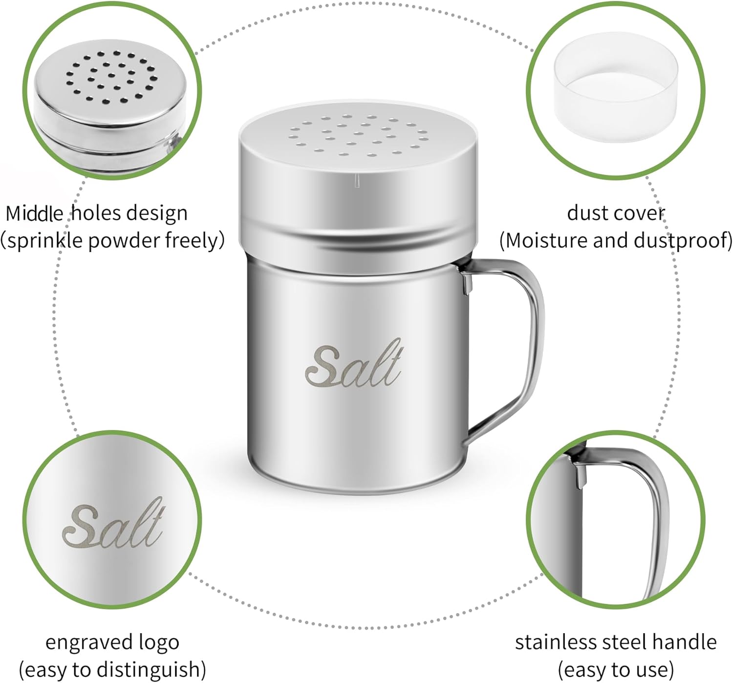 - MULTIPLE USAGES: Our stainless steel dredge shaker can hold various things, like peppers, candies, and and many other different kinds of spices ; It is also suitable for you to place it in your kitchen, restaurant, barbecue and many other indoor or outdoor occasions,or decorate desserts quickly!