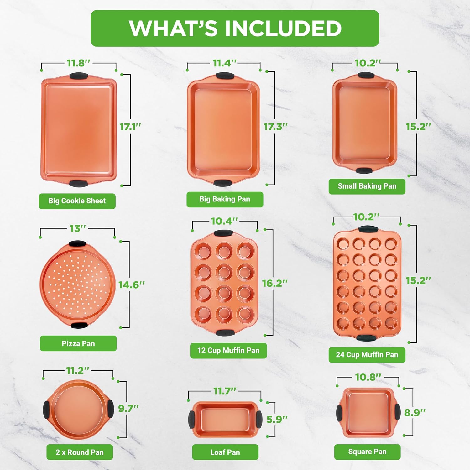 NutriChef 10-Piece Nonstick Baking Pan Set - Premium Carbon Steel Bakeware with Silicone Handles, Baking Pans, Pizza Pan, Square Pan, Loaf Pan, Cookie Sheet, Round Pan, 12/24 Cup Muffin Pan (Copper)