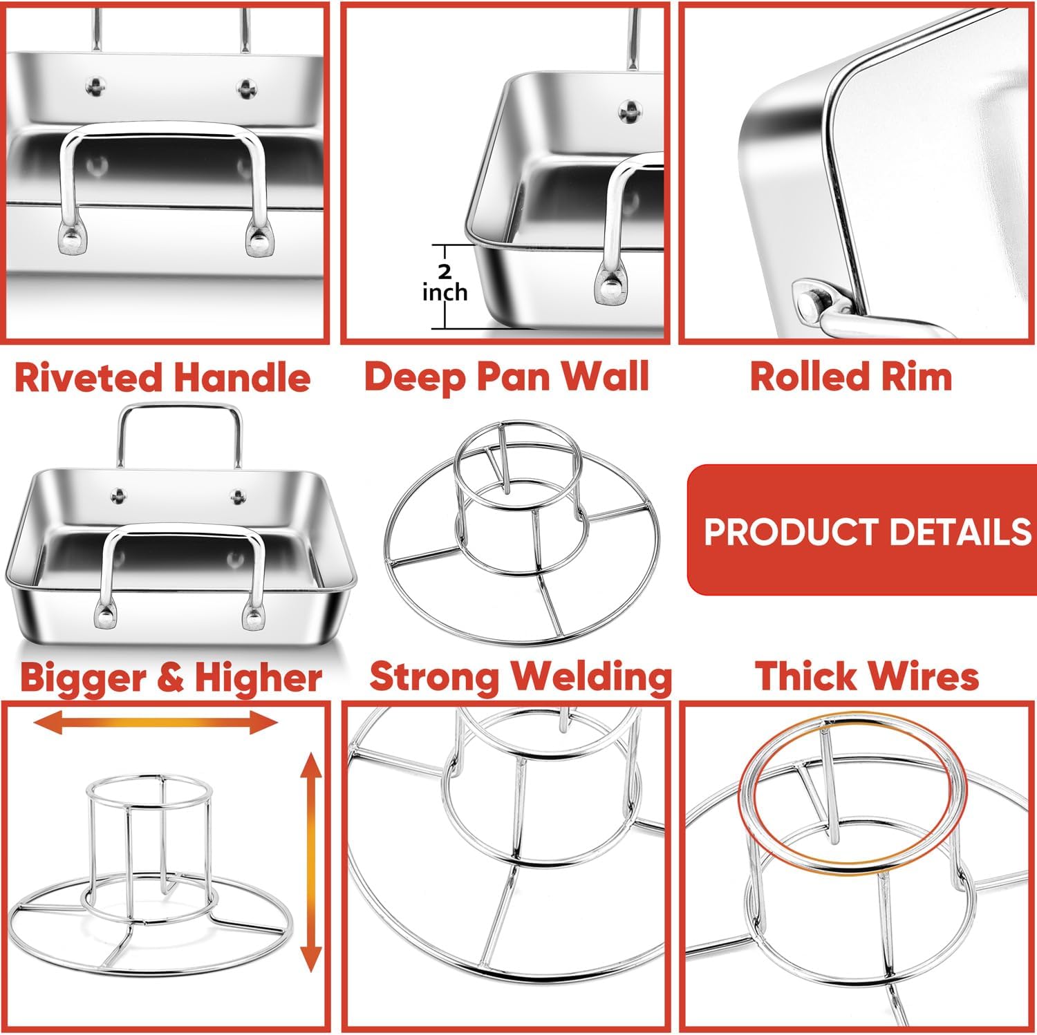 - Matching rack set, the 3.3 x 3-inch rack crafted with thick and sturdy stainless steel wires, which can stably hold heavy objects, and allow 12-ounce beer can in the center to ensure moist and juicy meat for the whole chicken, and achieves excellent brown and crispy effects