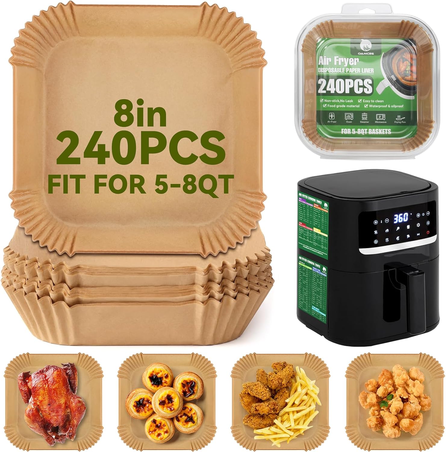 OAMCEG Air Fryer Disposable Liners,240 PCS Square Non-stick Disposable Liners for 5-8QT, 8 inch Air Fryer Parchment Baking Paper for Frying, Baking, Cooking, Roasting and Microwave