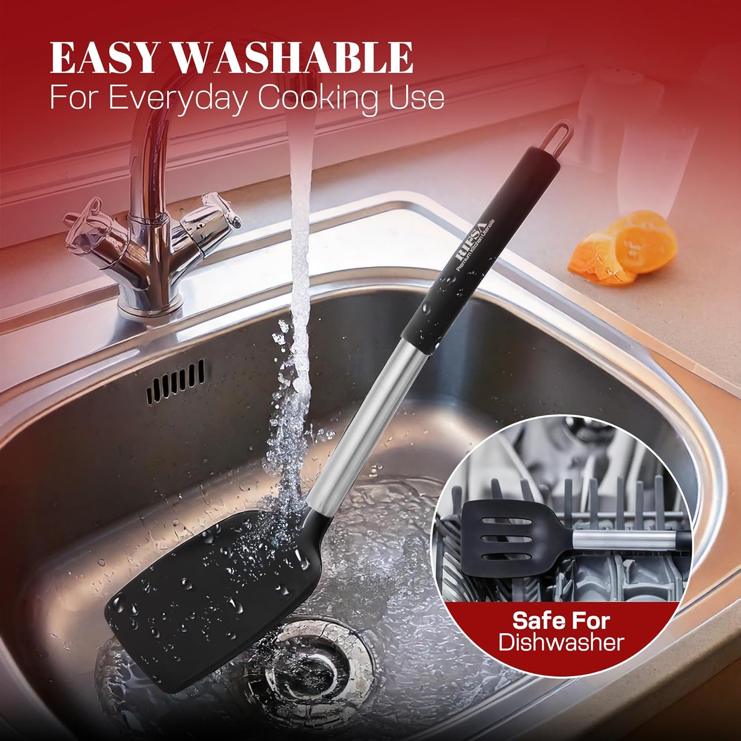 - ♦️[Cleaning in a Breeze ]➤ RIFSA heat resistant spatula’s simple design ensures easy cleanup with a rinse or wipe, and it's dishwasher-safe for added convenience. Its built-in hanging hole promotes effortless storage, keeping your kitchen tidy and the tool readily accessible for immediate use
