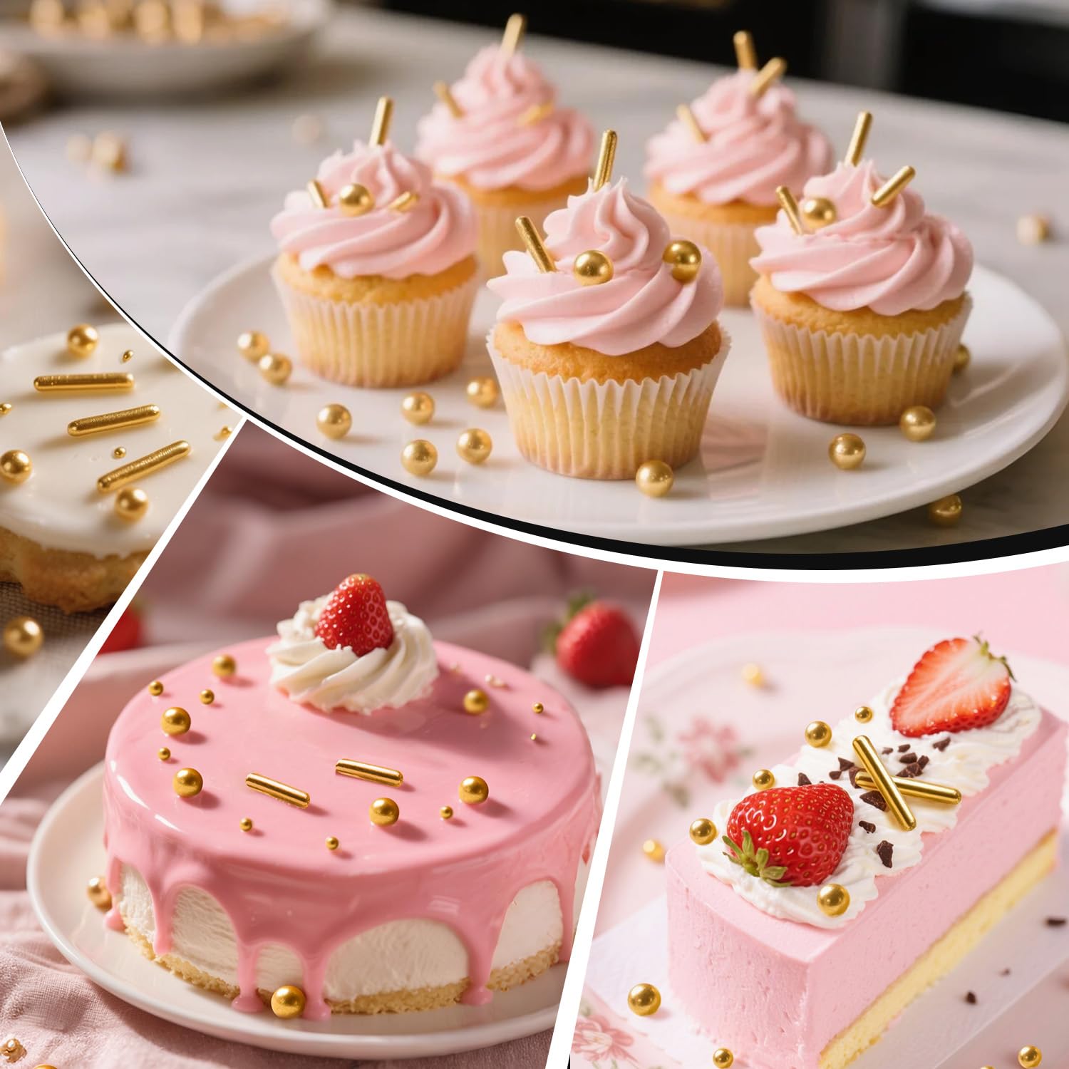 - These Gold Pearl Rods Sprinkles can enhance the visual appeal of desserts without influencing their taste. Made from superior-quality ingredients, they are created to improve the look of a wide variety of treats like cakes, cookies, cupcakes, donuts, waffles, ice cream, and many more.