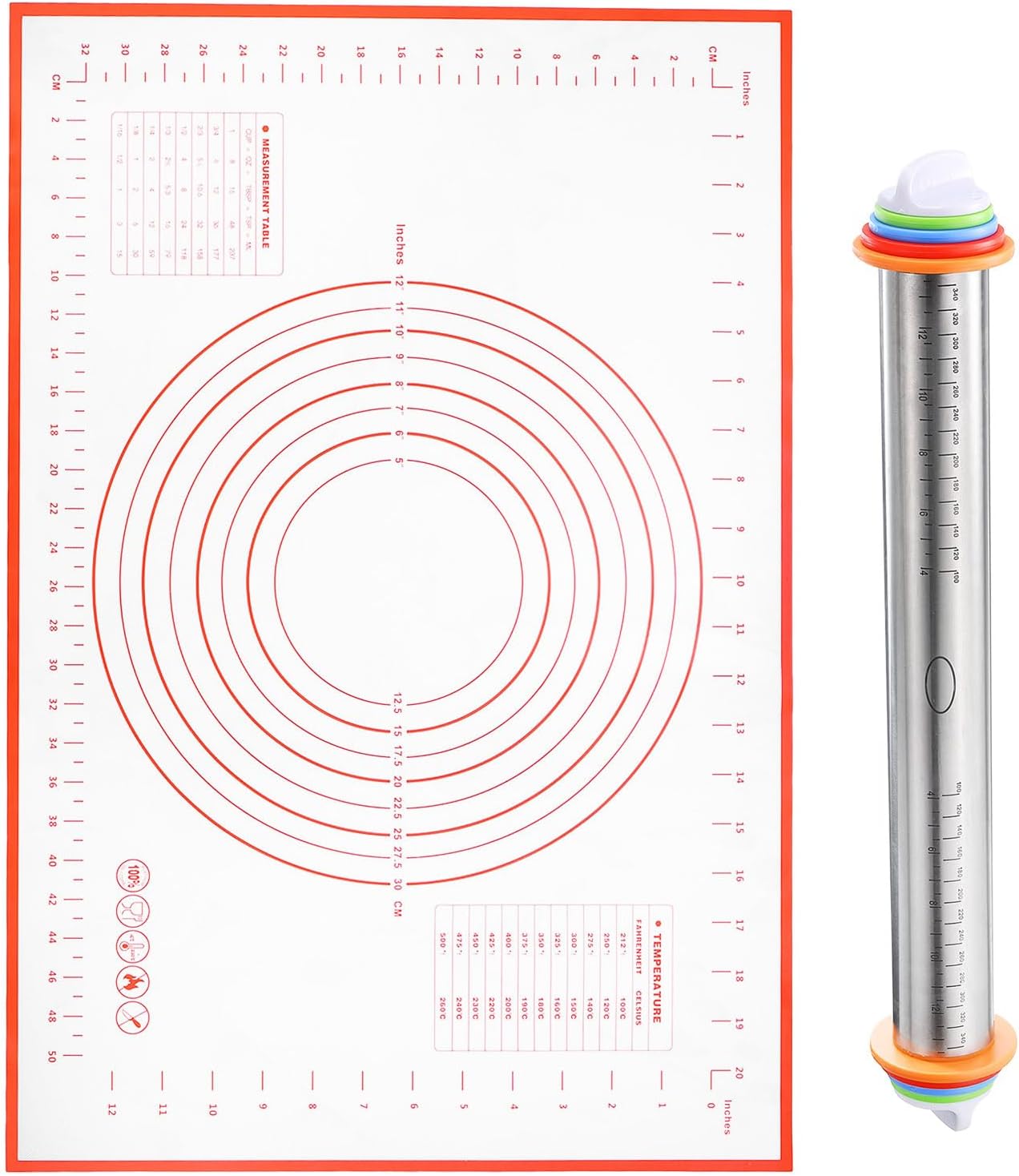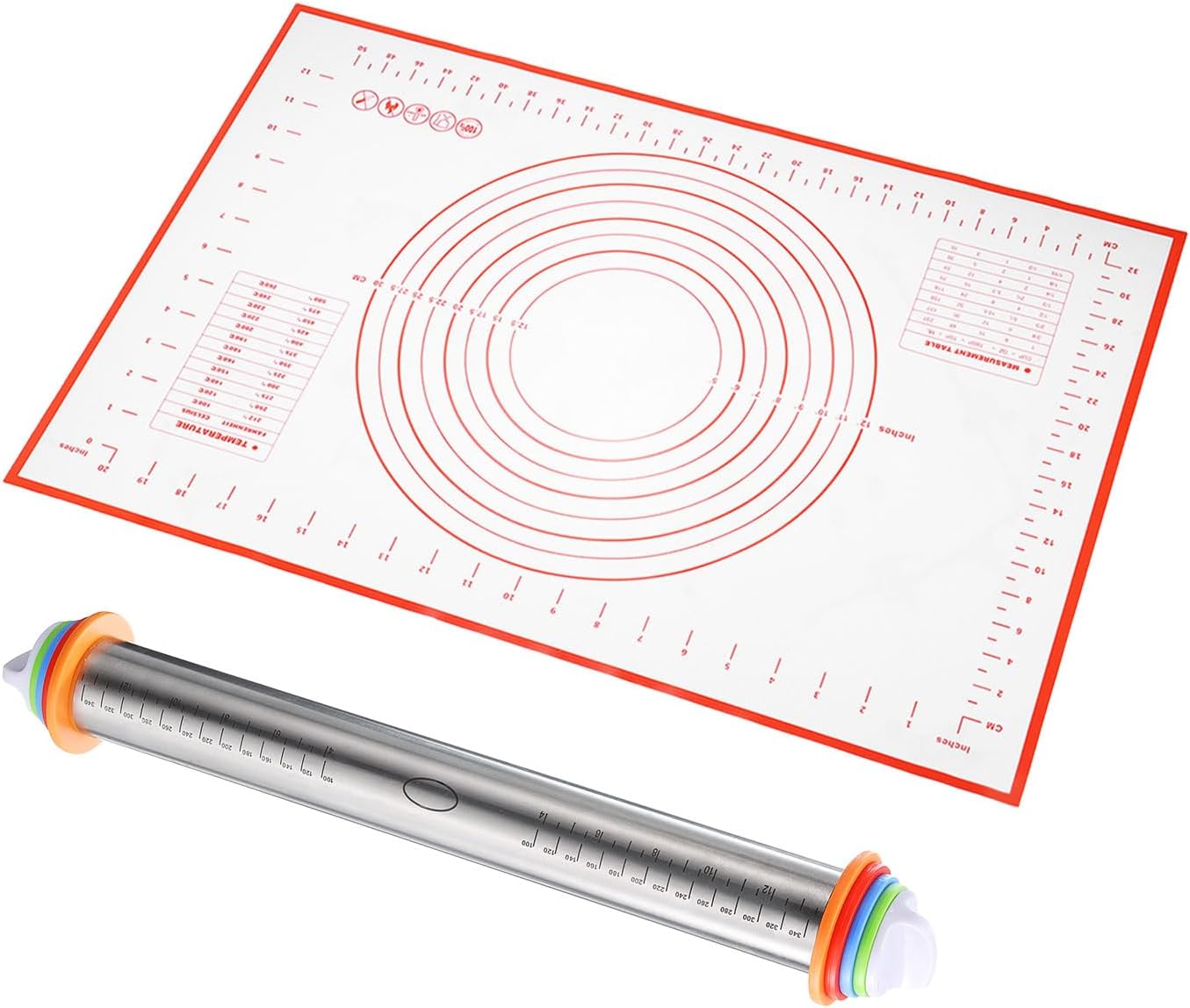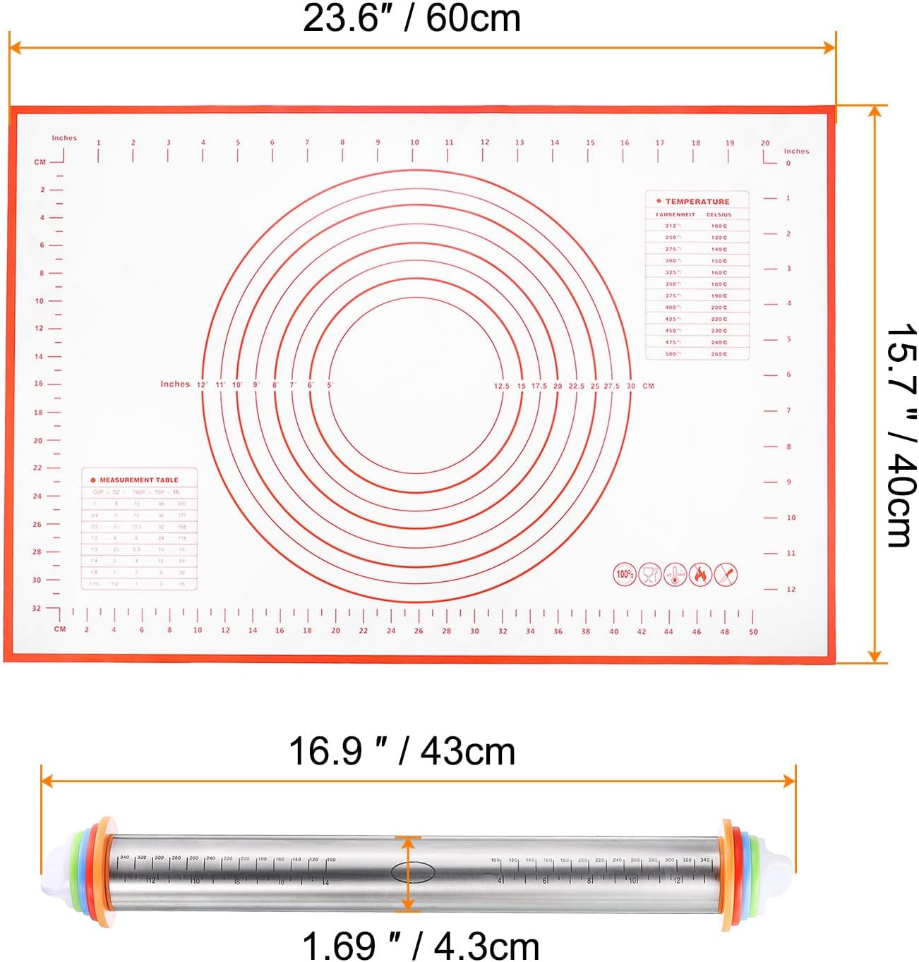 - Size - The plastic rolling pin measures 16.9 Inch x 1.69 Inch /43cm x 4.3cm (L*D), and is very light for long-time use without tired hands, and the size of the baking mat is about 23.6 inches Γ15.7 inches(60cm*40cm )
