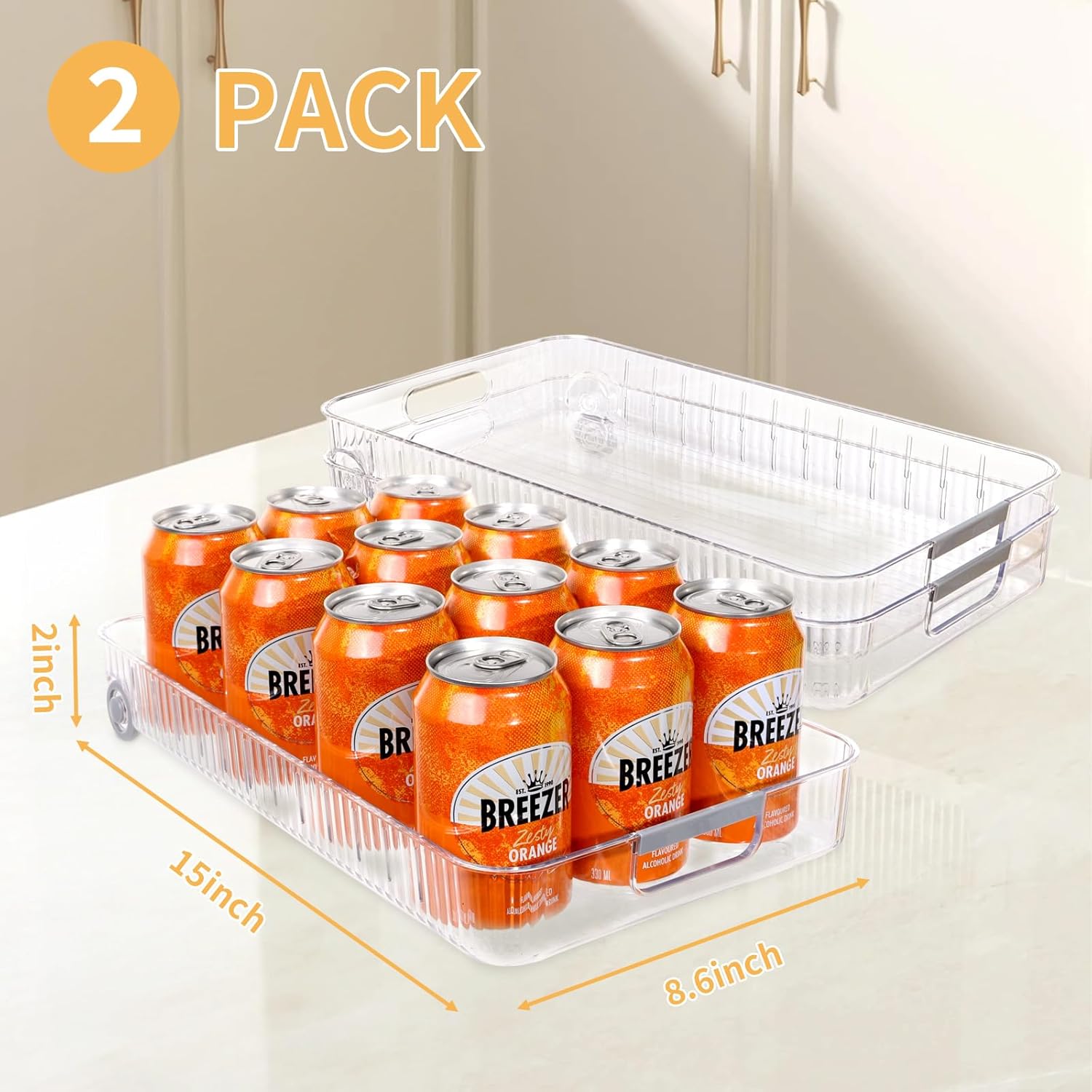 - Refrigerator Organizer and Storage Bins:(15"Lx8.6"Wx2"H) bins with smooth-rolling wheels for easy access.Clear organizer bins optimize fridge space and maintain tidiness—MEASURE refrigerator width before purchase.Multi-purpose for kitchen,cabinets,closets,offices,and bedrooms.