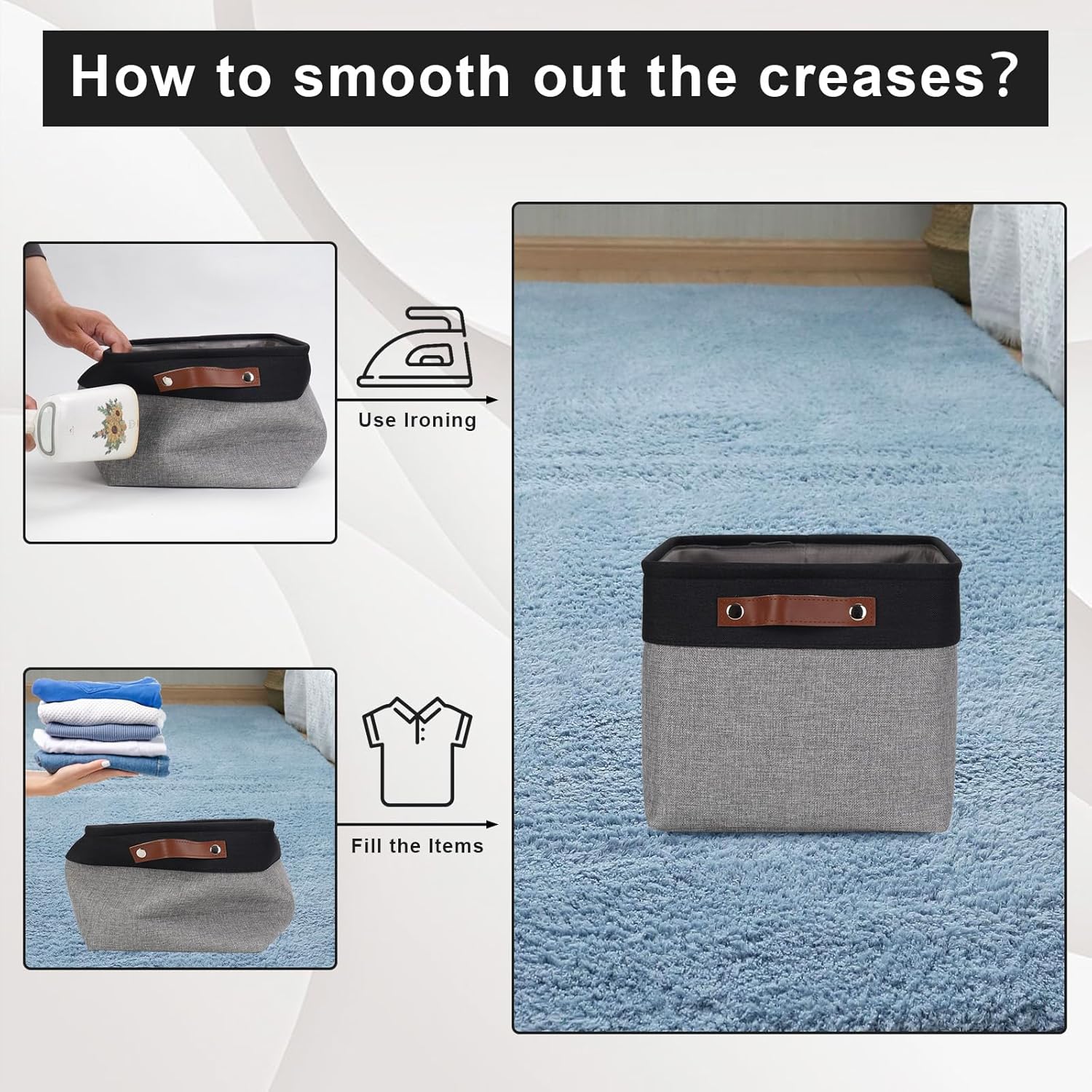 - 【Maintenance & Care Tip】 - Collapsible design for space saving. Our foldable baskets comes in a compression packing which may result in wrinkled storage bin during the long transit. Get rid of the wrinkles by either stuffing the fabric storage bins with blankets and pillows for a few days or steam iron them at low-heat setting. The organization baskets are easy to clean, you can dust the basket with a soft cloth with light soapy water when needed. Not recommended to machine wash.