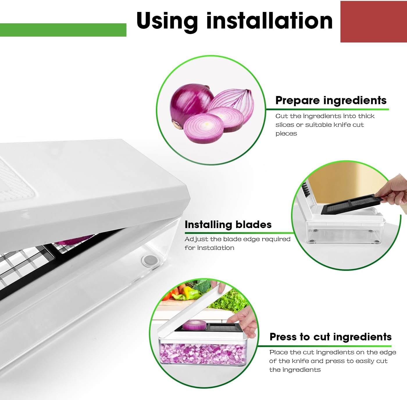 - SUPERIOR QUALITY: Professional multifunctional vegetable chopper slicer can chop and dice and more, all in one versatile kitchen gadget. Made of high quality materials, such as high quality stainless steel blades and food grade materials. A perfect tool for yourself or anyone who loves to cook.