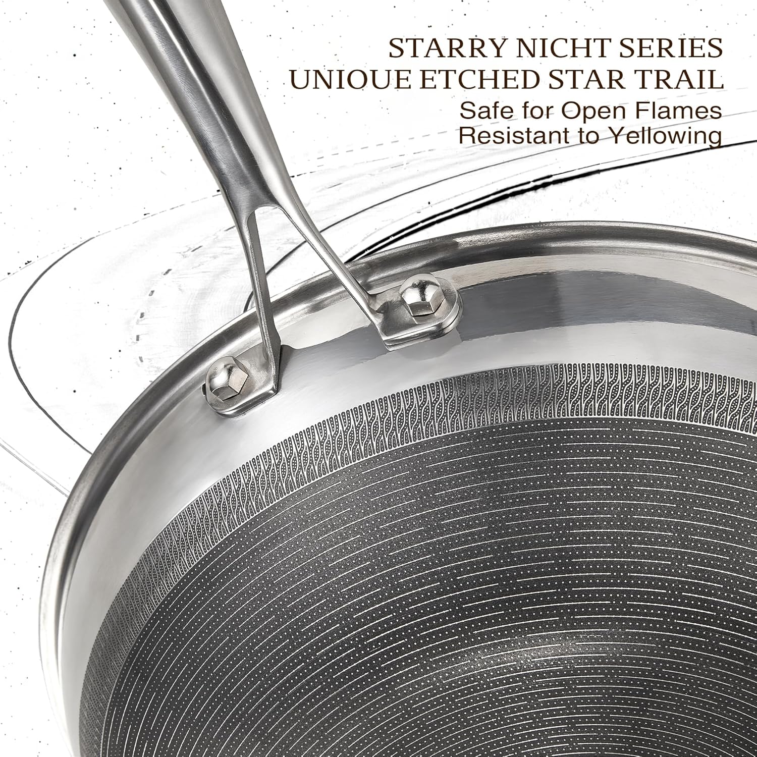 - Durable 5-Layer Structure: Built with a titanium ceramic interior, 4mm thick aluminum core, and dual-layer 403 stainless steel, this wok ensures quick, even heating and excellent durability. The star-trail etched exterior resists yellowing from flames and stains, locking in heat to preserve flavors and textures.