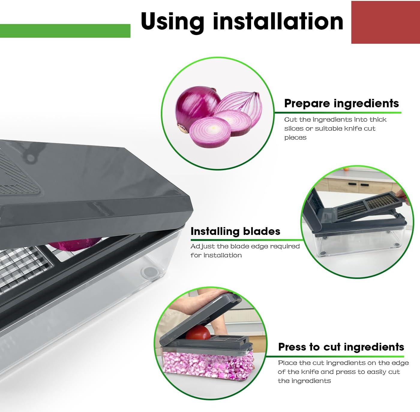 - SAFE AND USER-FRIENDLY DESIGN: The onionchopper prioritizes safety during use. It is equipped with a hand-held protective tool to prevent hand injuries. The blades are designed for easy insertion, removal, and locking, ensuring stability and safety. The non-slip bottom of the storage container enhances safety.