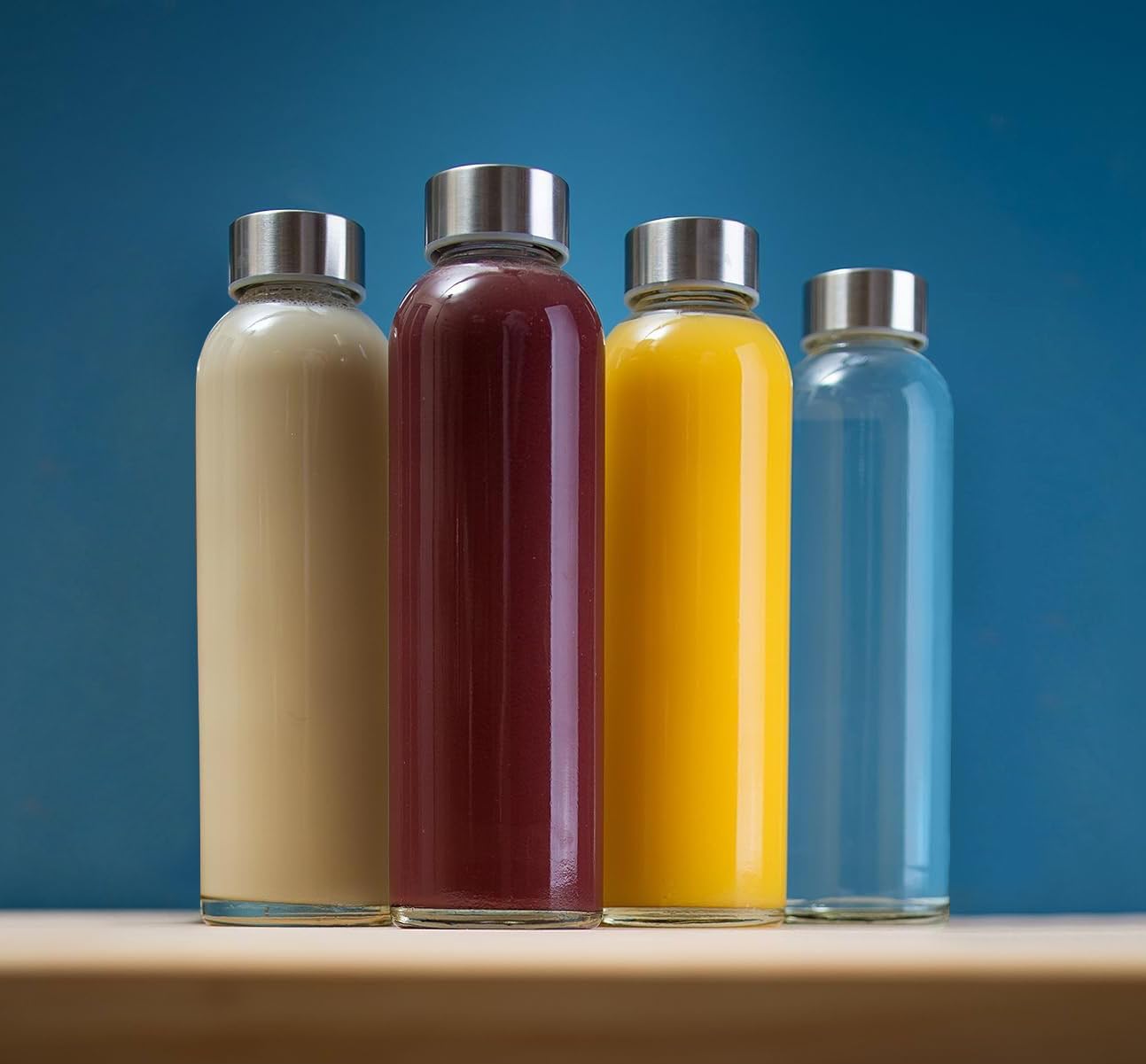 Epica 18-Oz Glass Water Bottles with Lids, Juice Bottles - BPA Free & Eco-Friendly Reusable Refillable Bottles for Juicing, Set of 4 - Clear