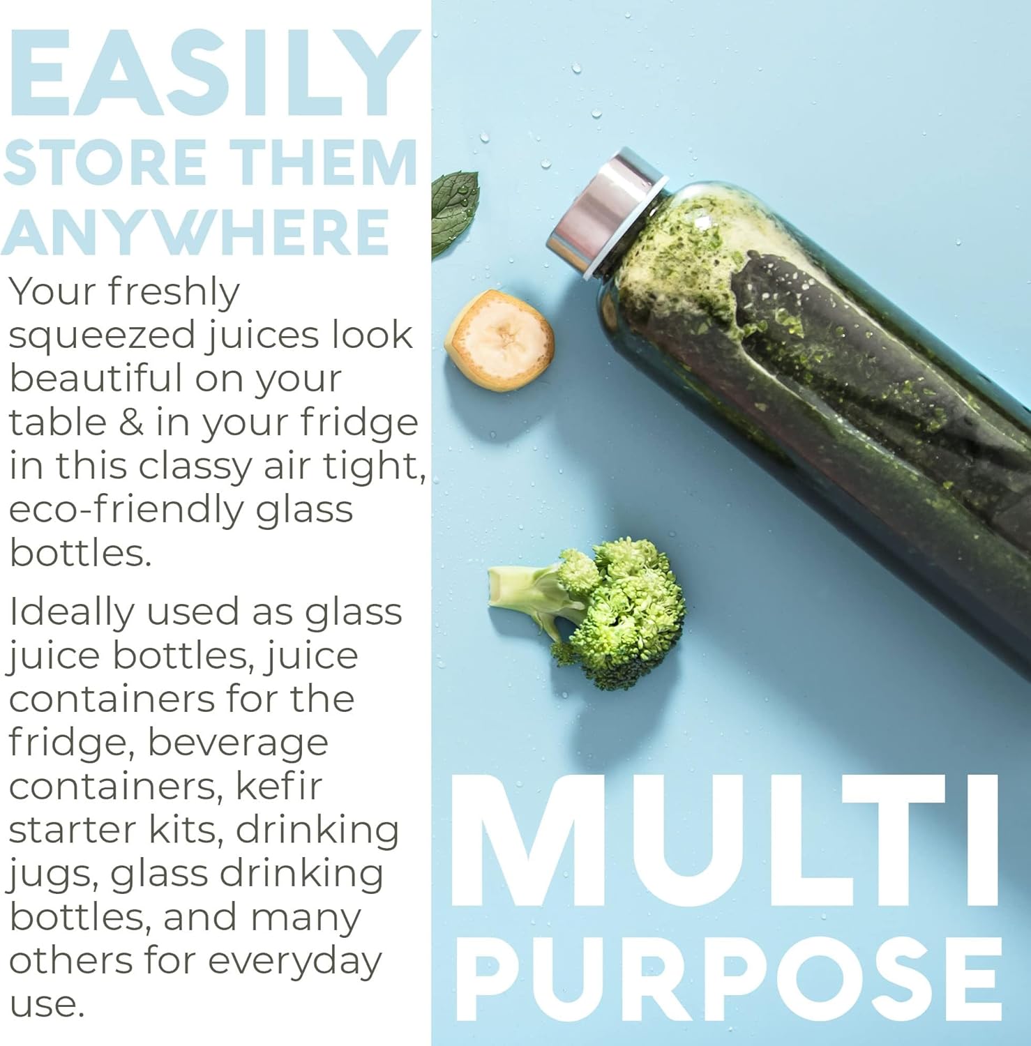 - THE MOST BEAUTIFUL EARTH-FRIENDLY JUICE BOTTLES IN YOUR KITCHEN: Your fresh-squeezed juices look gorgeous on your table and in your fridge in these classy air-tight and Eco-friendly bottles.
