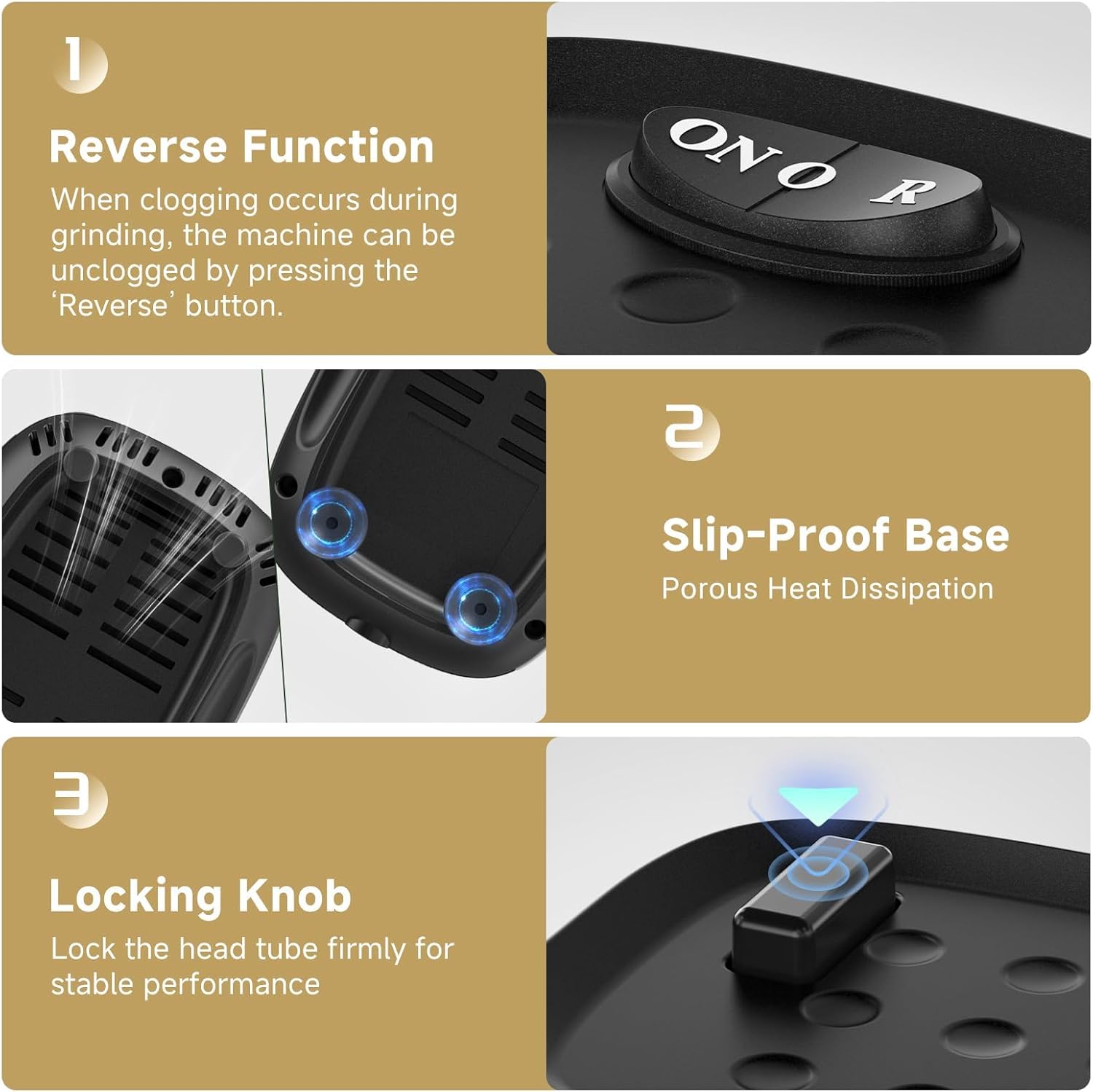 - Safe & Thoughtful Design: The locking knob and overload protection provide safety for use. With a thermostat system, an automatic built-in circuit breaker for protection can prevent the motor from overheating.Press the โReverseโ button feature for unclogging the machine.Tip: Avoid grinding meat with bones,tendons, or skin to prevent from jamming