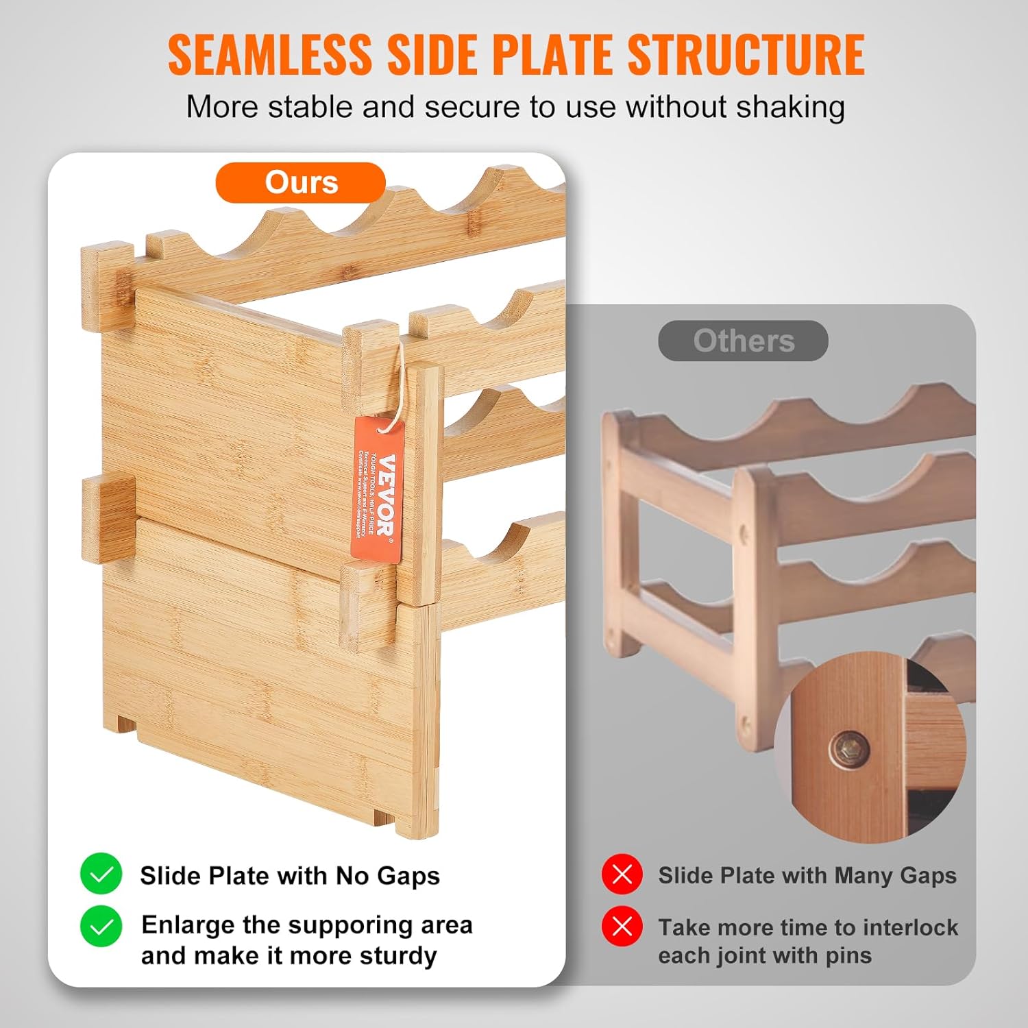 - Natural Bamboo Wood: Our wine storage rack is made from high-quality bamboo, which is smooth, crack-resistant, and less likely to absorb moisture or mold. The natural bamboo has excellent resilience and supports wine bottles perfectly without wobbling.