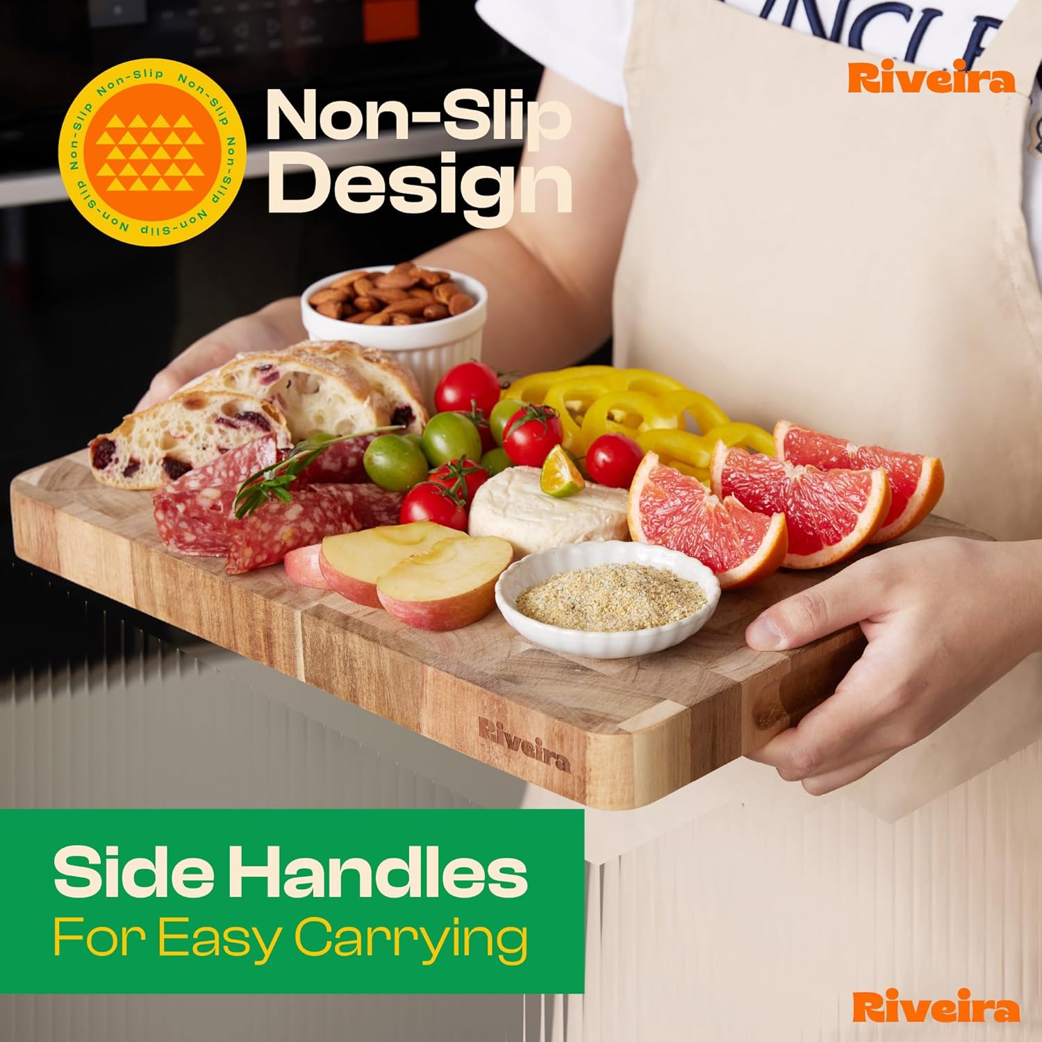 - Handle Everything with Confidence — The built-in handle holds of the acacia cutting board wood are designed for handling everything with confidence and easy maneuvering. Pre-oiled and ready for immediate bewilderment, this cutting boards wood is not just convenient for the kitchen mess but has a unique design to maintain, ensuring a performance that is both comfortable and clean for butchers block. Riviera best cutting board will be perfect in your kitchen.