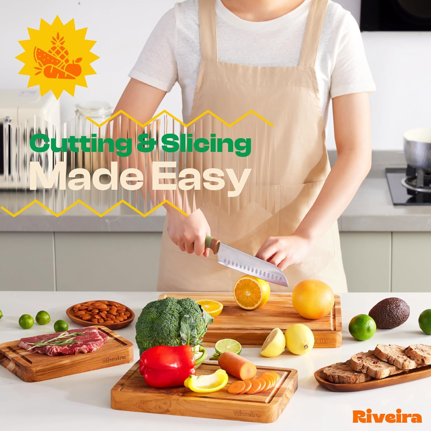 - Premium Crafted Teak — Take a detour from traditional kitchen aesthetics with this teak wood board crafted from 100% natural teak. Beyond being an unconventional and eco-friendly choice, the chopping board wood proudly showcases the environment friendly and organic teak. This wood cutting boards for kitchen counter adds an unexpected touch of confidence and style to your once-orderly culinary space. Riviera's wooden chopping boards for kitchen will be there for you for many years to come.