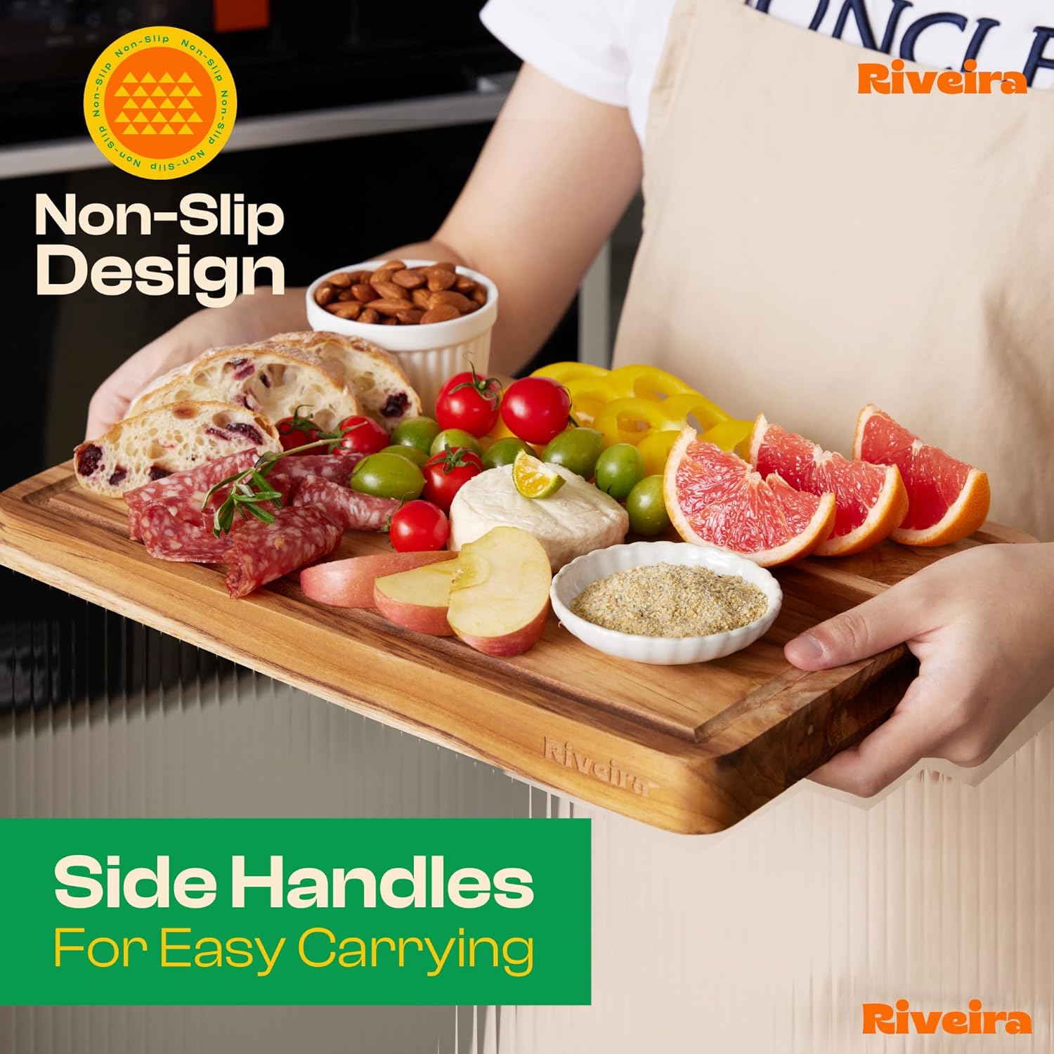 - Handle Everything with Confidence — The built-in handle holds of the teak cutting boards are designed for handling everything with confidence and easy maneuvering. Pre-oiled and ready for immediate bewilderment, this wooden chopping board is not just convenient for the kitchen mess but has a unique design to maintain, ensuring a performance that is both comfortable and clean for chopping boards for kitchen. Riviera non toxic cutting boards for kitchen will be perfect in your kitchen.