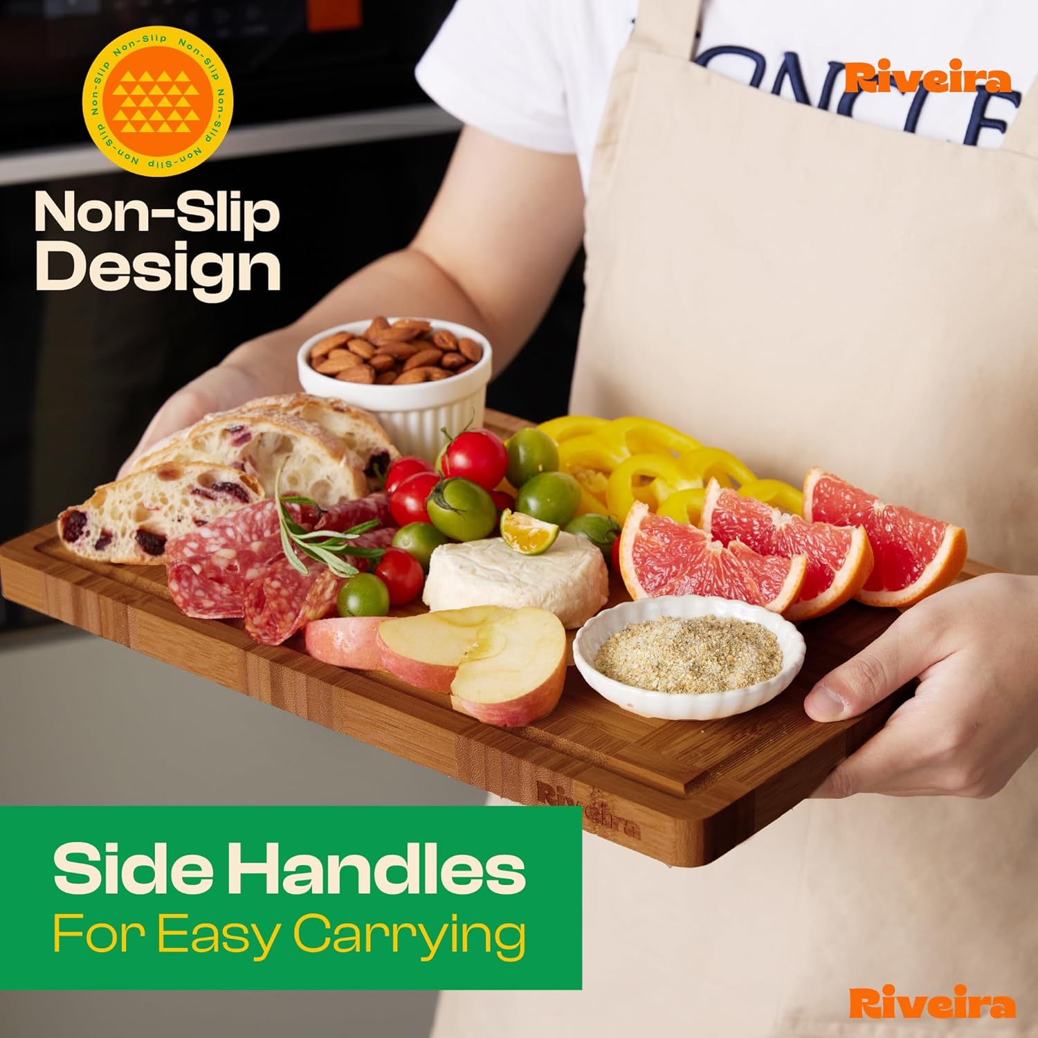 - No Mess Cutting and Transfer — Enjoy a mess-free kitchen with our end grain kitchen wooden cutting board set. Equipped with deep juice grooves, these nice cutting board set catch liquid runoff from meat, fruit, and other ingredients. Whether you're working in an industrial restaurant kitchen or your home, this 3 piece cutting board set makes cleanup a breeze. Transfer ingredients from your prep station without any fuss with Riveira bamboo cutting board set of 3.