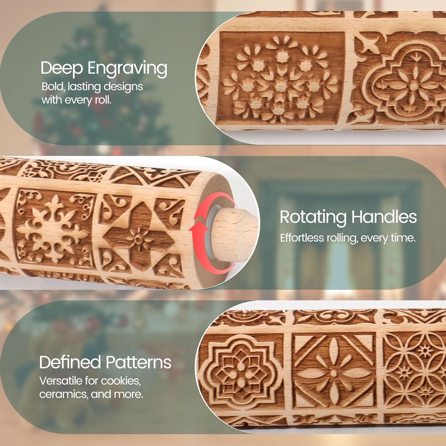 - 🍪 Deep and Clear Embossing. This vintage Christmas embossing rolling pins for baking with design is a perfect kitchen utensil. You will enjoy your baking time with our wooden rolling pin with designs embossed. Teach your child to make delicious shortbread cookies or just let them DIY with our Christmas laser engraved rolling pins for baking. Also, it’s a fantastic, embossed rolling pin for clay.