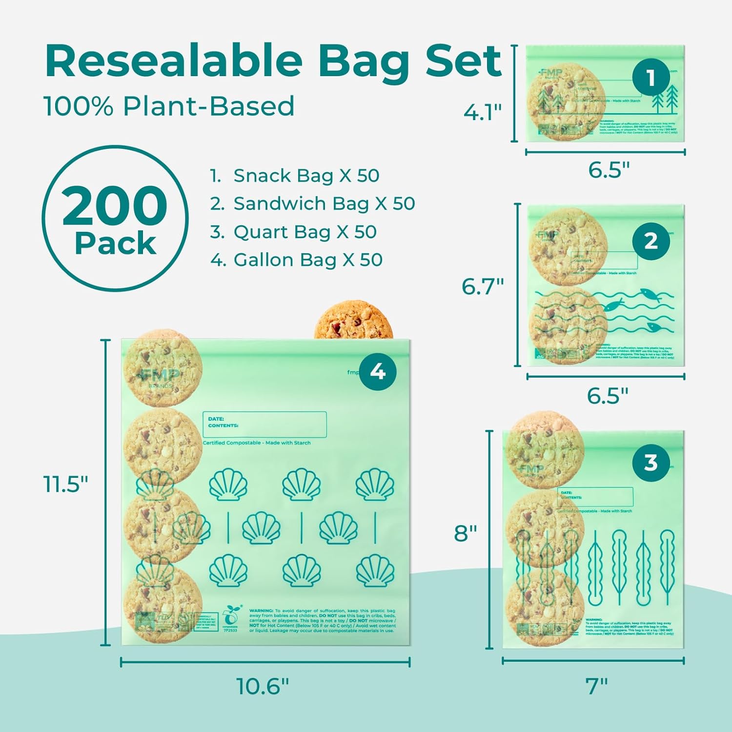 Fit Meal Prep 100% Compostable Food Storage Bags Set, Resealable Bags Plant-Based Freezer Bag for Food, ASTM D6400, US BPI & EU OK Compost Certified
