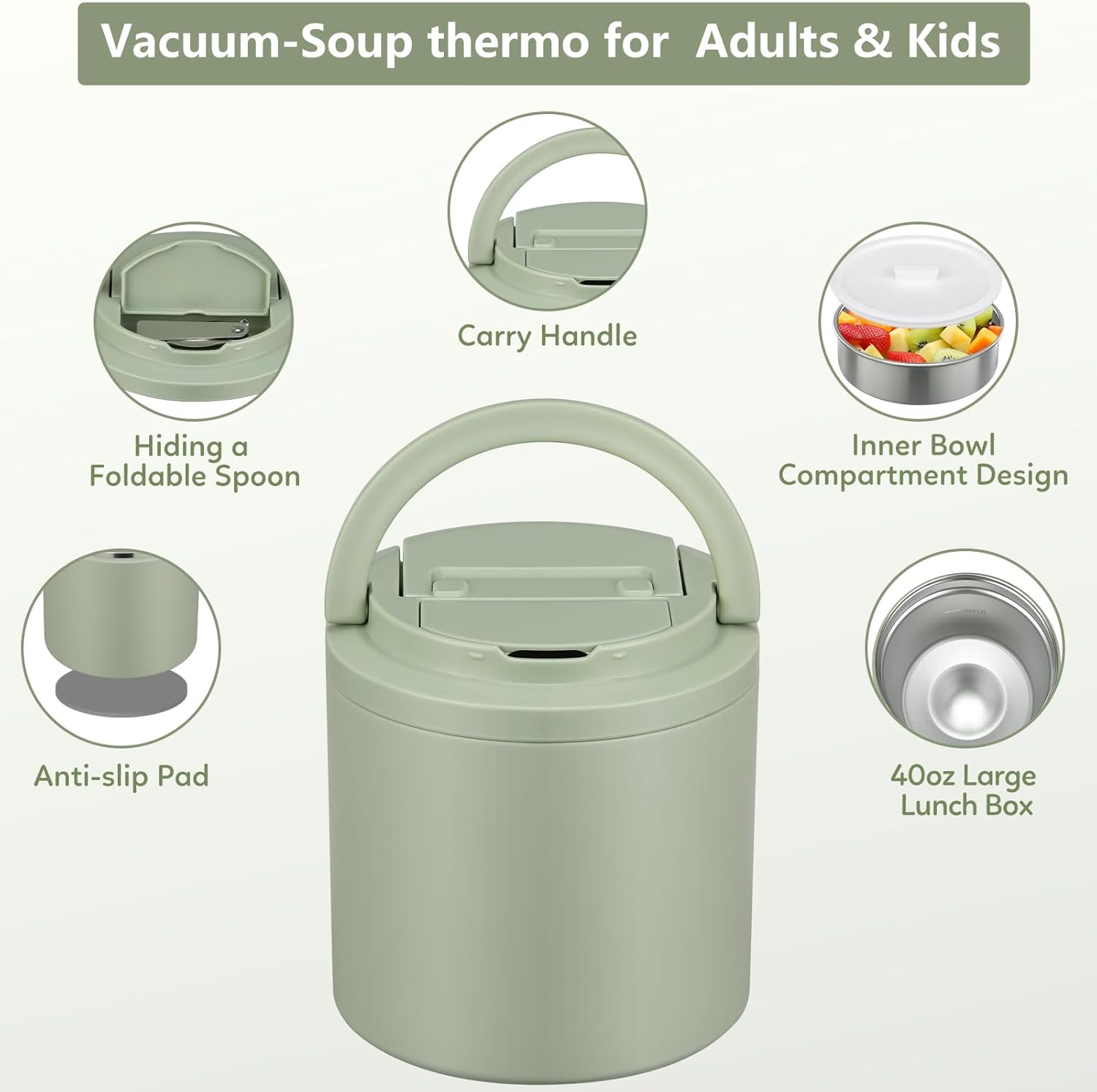 Soup Thermo for Hot Food Adults 40oz Lunch Containers Wide, Thermo Insulated Containers Leak Proof Vacuum Stainless Steel With Carry Handle and Spoon BPA Free (Green)
