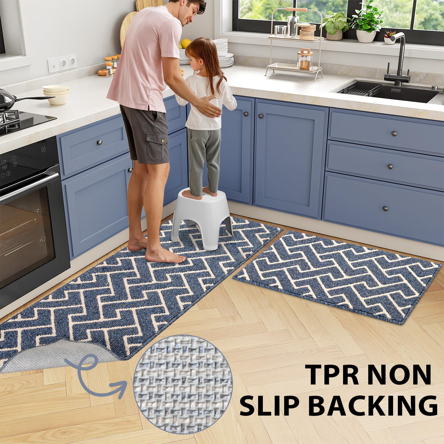 - NON-SLIP BACKING: High quality TPR backing to keep the kitchen mat firmly in place and prevent shifting and skidding. Provide better security for families with children or the elder. Attention: The kitchen rug underlay should be clean, flat, and dry before placing the mat on the floor. Water or dust under mat may cause slippage.