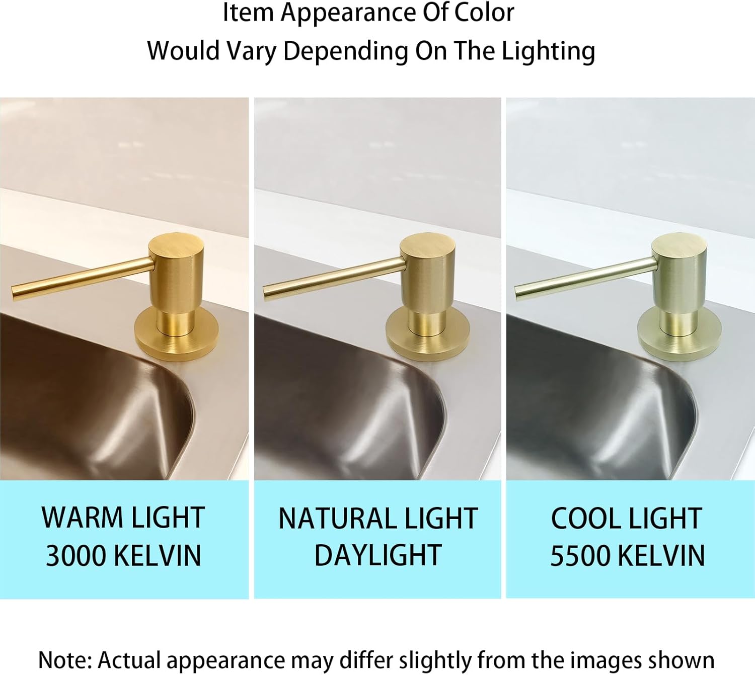- Built To Last:Sturdy built in sink soap dispenser for kitchen sink,pump head, pump core and threaded tube are made with solid brass, equipped with corrosion resistant spring. It comes with a 17 OZ PET bottle. Brushed gold rust resistant finish that will not tarnish as time goes on. The heavy soap dispenser pump mechanism is designed for long lasting excellent performance to dispense consistently with each and every press. Matching perfectly with most faucet models from different brands.
