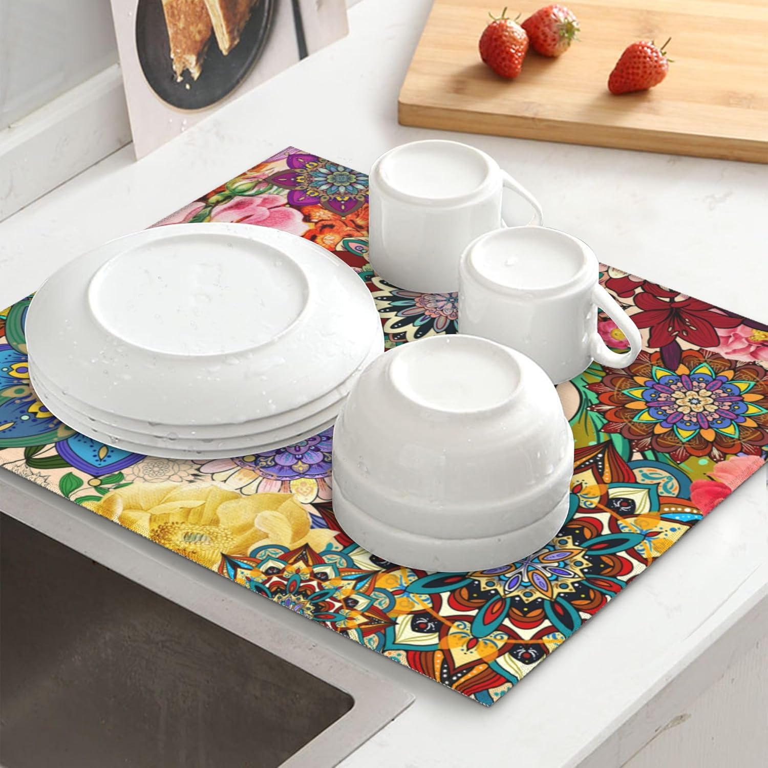 Boho Floral Dish Drying Mat for Kitchen Counter Washable Absorbent Reversible Microfiber Colorful Flowers Drying Pad Kitchen Accessories 16x18 Inch